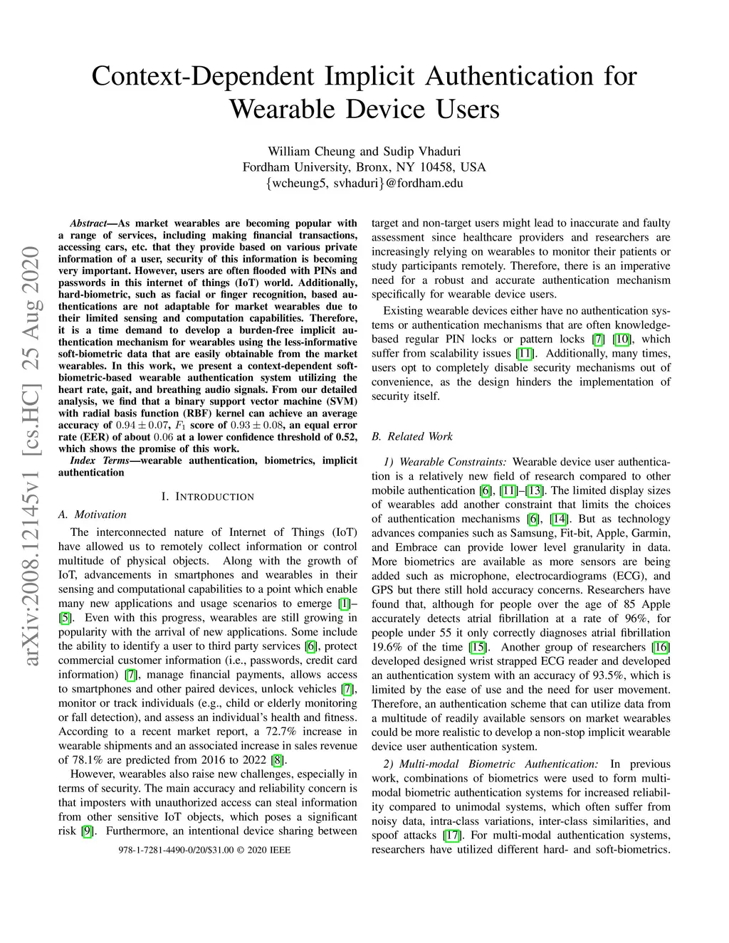As market wearables are becoming popular with a range of services, including making financial transactions, accessing cars, etc. that they provide based on various private information of a user, security of this information is becoming very important. However, users are often flooded with PINs and passwords in this internet of things (IoT) world. Additionally, hard-biometric, such as facial or finger recognition, based authentications are not adaptable for market wearables due to their limited sensing and computation capabilities. Therefore, it is a time demand to develop a burden-free implicit authentication mechanism for wearables using the less-informative soft-biometric data that are easily obtainable from the market wearables. In this work, we present a context-dependent soft-biometric-based wearable authentication system utilizing the heart rate, gait, and breathing audio signals. From our detailed analysis, we find that a binary support vector machine (SVM) with radial basis function (RBF) kernel can achieve an average accuracy of , score of , an equal error rate (EER) of about at a lower confidence threshold of 0.52, which shows the promise of this work.