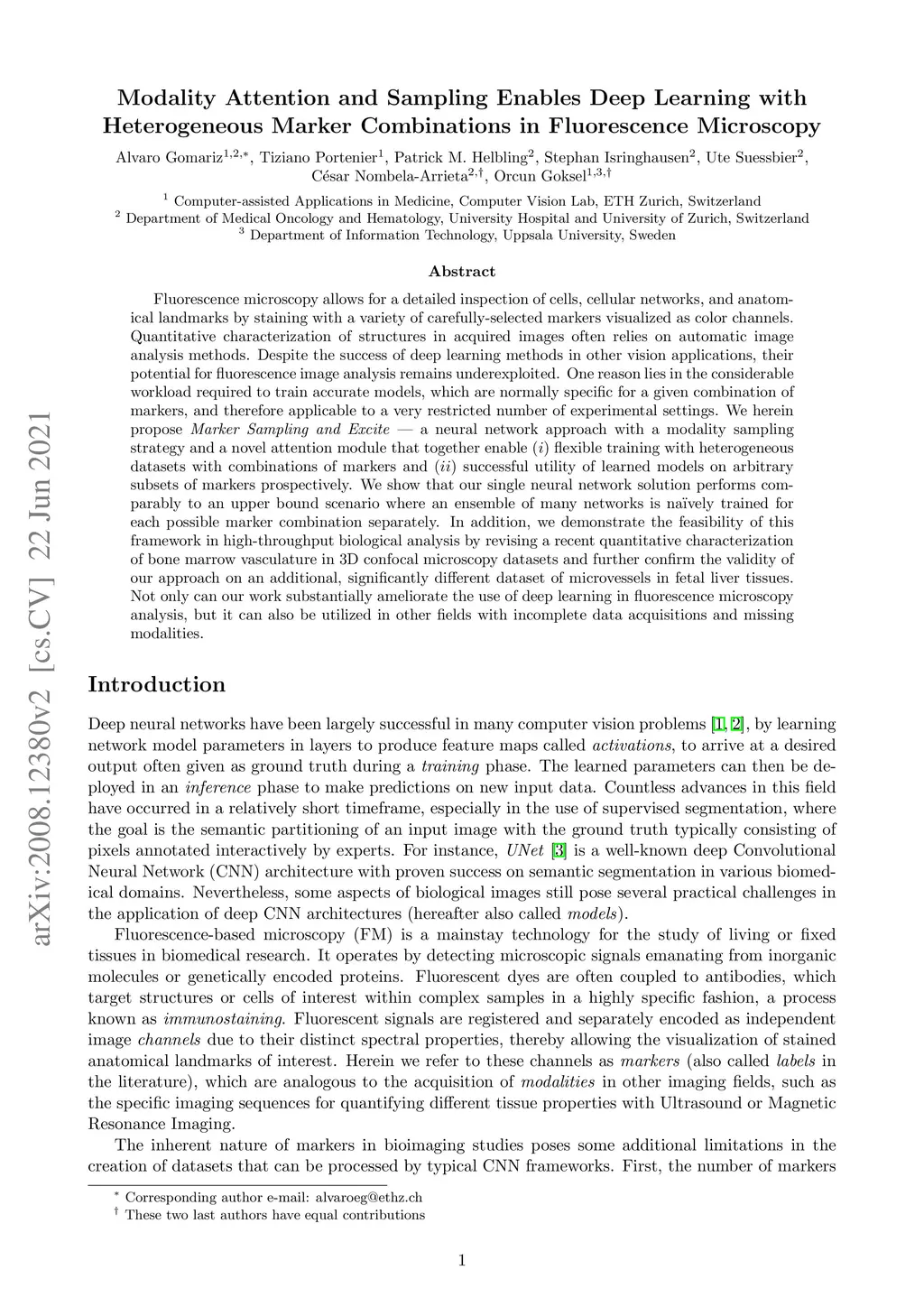 Fluorescence microscopy allows for a detailed inspection of cells, cellular networks, and anatomical landmarks by staining with a variety of carefully-selected markers visualized as color channels. Quantitative characterization of structures in acquired images often relies on automatic image analysis methods. Despite the success of deep learning methods in other vision applications, their potential for fluorescence image analysis remains underexploited. One reason lies in the considerable workload required to train accurate models, which are normally specific for a given combination of markers, and therefore applicable to a very restricted number of experimental settings. We herein propose Marker Sampling and Excite, a neural network approach with a modality sampling strategy and a novel attention module that together enable (i) flexible training with heterogeneous datasets with combinations of markers and (ii) successful utility of learned models on arbitrary subsets of markers prospectively. We show that our single neural network solution performs comparably to an upper bound scenario where an ensemble of many networks is na\"ively trained for each possible marker combination separately. In addition, we demonstrate the feasibility of this framework in high-throughput biological analysis by revising a recent quantitative characterization of bone marrow vasculature in 3D confocal microscopy datasets and further confirm the validity of our approach on an additional, significantly different dataset of microvessels in fetal liver tissues. Not only can our work substantially ameliorate the use of deep learning in fluorescence microscopy analysis, but it can also be utilized in other fields with incomplete data acquisitions and missing modalities.