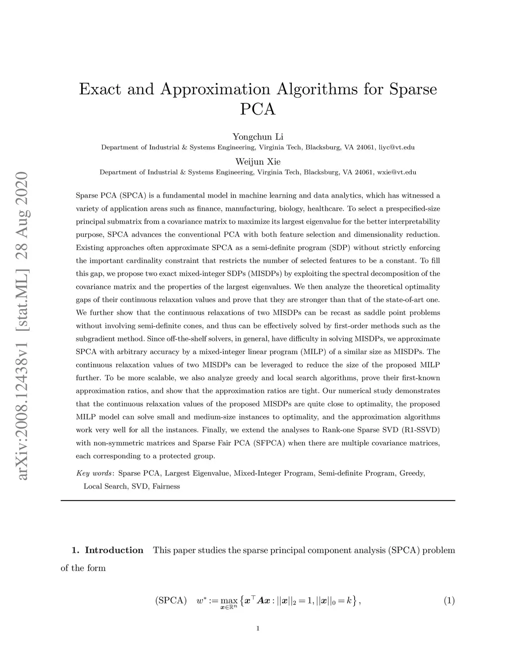 Sparse PCA (SPCA) is a fundamental model in machine learning and data analytics, which has witnessed a variety of application areas such as finance, manufacturing, biology, healthcare. To select a prespecified-size principal submatrix from a covariance matrix to maximize its largest eigenvalue for the better interpretability purpose, SPCA advances the conventional PCA with both feature selection and dimensionality reduction. This paper proposes two exact mixed-integer SDPs (MISDPs) by exploiting the spectral decomposition of the covariance matrix and the properties of the largest eigenvalues. We then analyze the theoretical optimality gaps of their continuous relaxation values and prove that they are stronger than that of the state-of-art one. We further show that the continuous relaxations of two MISDPs can be recast as saddle point problems without involving semi-definite cones, and thus can be effectively solved by first-order methods such as the subgradient method. Since off-the-shelf solvers, in general, have difficulty in solving MISDPs, we approximate SPCA with arbitrary accuracy by a mixed-integer linear program (MILP) of a similar size as MISDPs. To be more scalable, we also analyze greedy and local search algorithms, prove their first-known approximation ratios, and show that the approximation ratios are tight. Our numerical study demonstrates that the continuous relaxation values of the proposed MISDPs are quite close to optimality, the proposed MILP model can solve small and medium-size instances to optimality, and the approximation algorithms work very well for all the instances. Finally, we extend the analyses to Rank-one Sparse SVD (R1-SSVD) with non-symmetric matrices and Sparse Fair PCA (SFPCA) when there are multiple covariance matrices, each corresponding to a protected group.