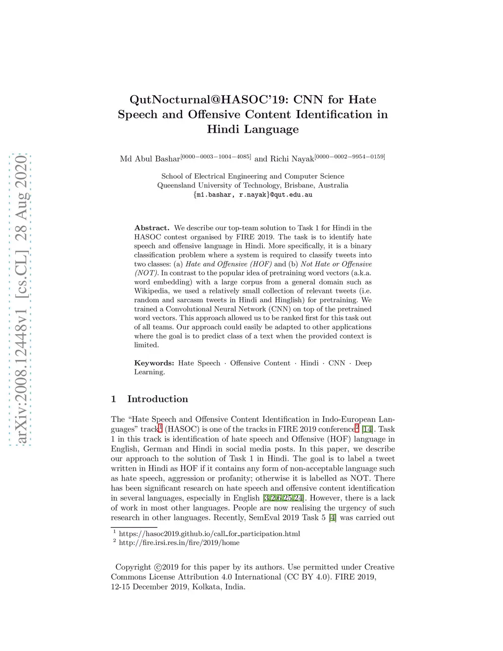 QutNocturnal@HASOC'19: CNN for Hate Speech and Offensive Content