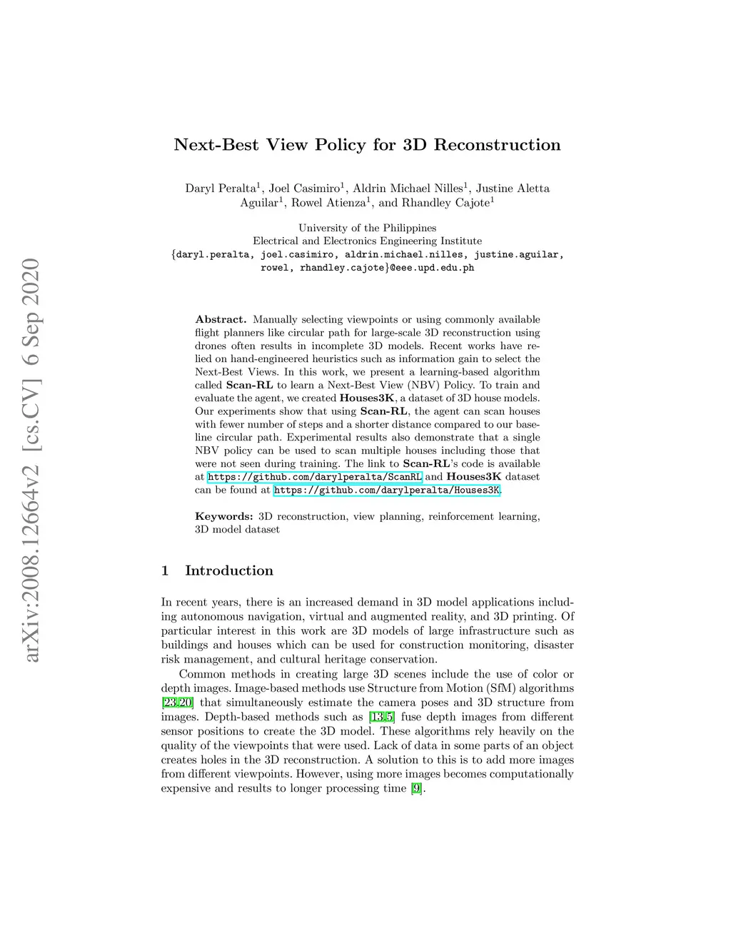 Manually selecting viewpoints or using commonly available flight planners like circular path for large-scale 3D reconstruction using drones often results in incomplete 3D models. Recent works have relied on hand-engineered heuristics such as information gain to select the Next-Best Views. In this work, we present a learning-based algorithm called Scan-RL to learn a Next-Best View (NBV) Policy. To train and evaluate the agent, we created Houses3K, a dataset of 3D house models. Our experiments show that using Scan-RL, the agent can scan houses with fewer number of steps and a shorter distance compared to our baseline circular path. Experimental results also demonstrate that a single NBV policy can be used to scan multiple houses including those that were not seen during training. The link to Scan-RL is available at https://github.com/darylperalta/ScanRL and Houses3K dataset can be found at https://github.com/darylperalta/Houses3K.