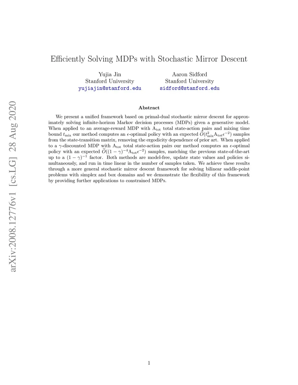 Efficiently Solving MDPs with Stochastic Mirror Descent
