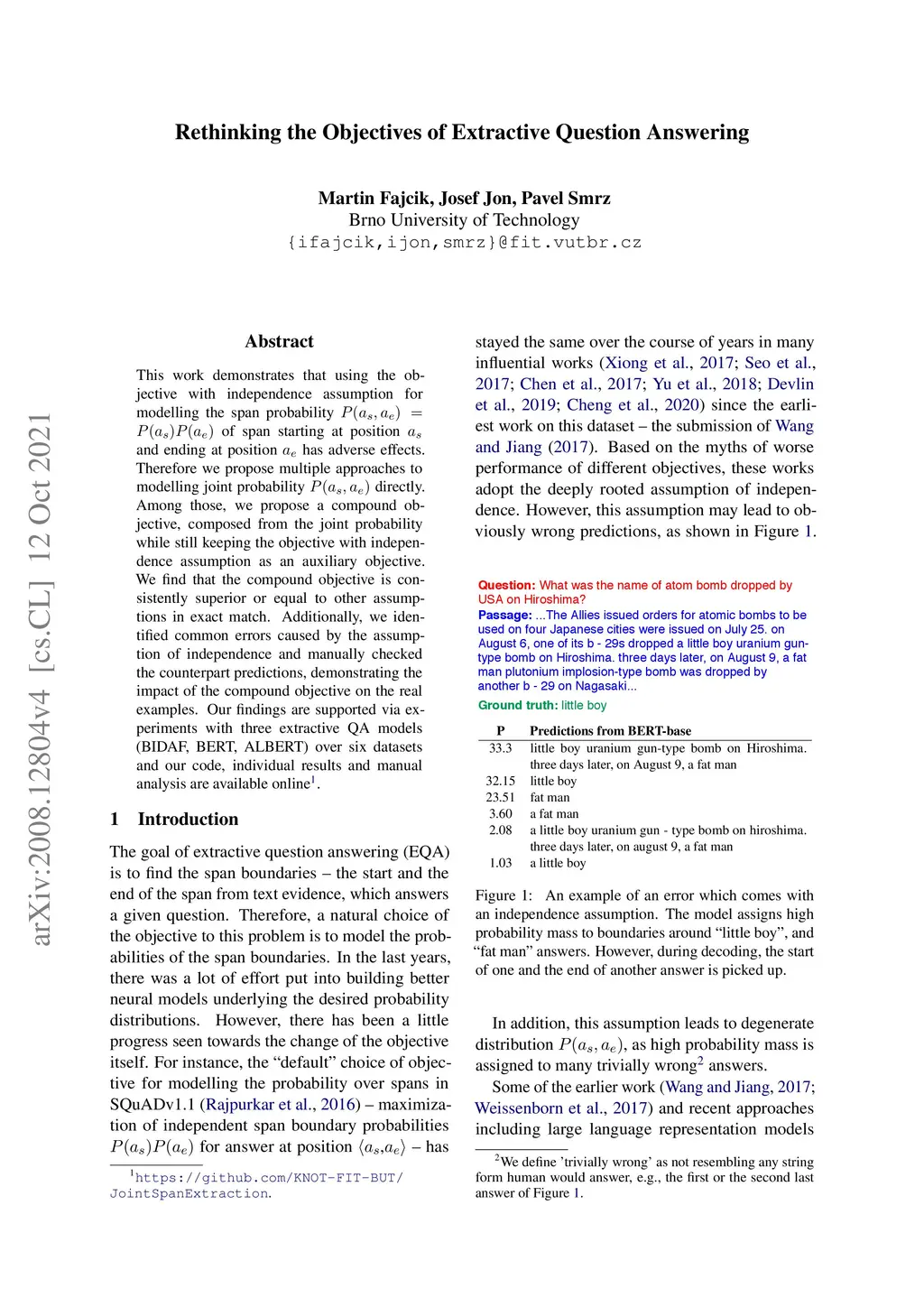 This work demonstrates that using the objective with independence assumption for modelling the span probability of span starting at position and ending at position has adverse effects. Therefore we propose multiple approaches to modelling joint probability directly. Among those, we propose a compound objective, composed from the joint probability while still keeping the objective with independence assumption as an auxiliary objective. We find that the compound objective is consistently superior or equal to other assumptions in exact match. Additionally, we identified common errors caused by the assumption of independence and manually checked the counterpart predictions, demonstrating the impact of the compound objective on the real examples. Our findings are supported via experiments with three extractive QA models (BIDAF, BERT, ALBERT) over six datasets and our code, individual results and manual analysis are available online.