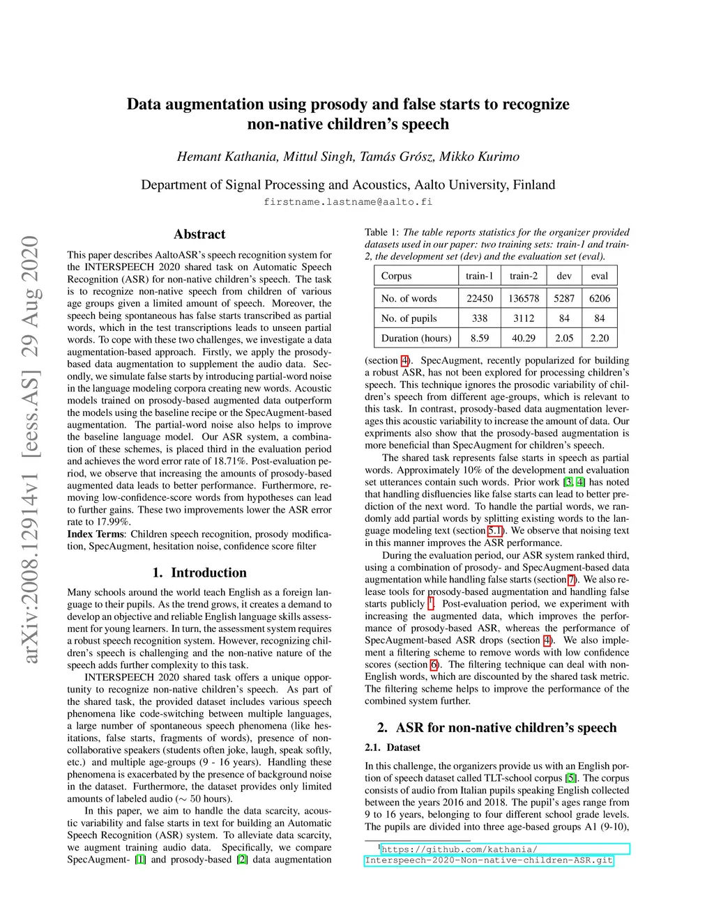 This paper describes AaltoASR's speech recognition system for the INTERSPEECH 2020 shared task on Automatic Speech Recognition (ASR) for non-native children's speech. The task is to recognize non-native speech from children of various age groups given a limited amount of speech. Moreover, the speech being spontaneous has false starts transcribed as partial words, which in the test transcriptions leads to unseen partial words. To cope with these two challenges, we investigate a data augmentation-based approach. Firstly, we apply the prosody-based data augmentation to supplement the audio data. Secondly, we simulate false starts by introducing partial-word noise in the language modeling corpora creating new words. Acoustic models trained on prosody-based augmented data outperform the models using the baseline recipe or the SpecAugment-based augmentation. The partial-word noise also helps to improve the baseline language model. Our ASR system, a combination of these schemes, is placed third in the evaluation period and achieves the word error rate of 18.71%. Post-evaluation period, we observe that increasing the amounts of prosody-based augmented data leads to better performance. Furthermore, removing low-confidence-score words from hypotheses can lead to further gains. These two improvements lower the ASR error rate to 17.99%.