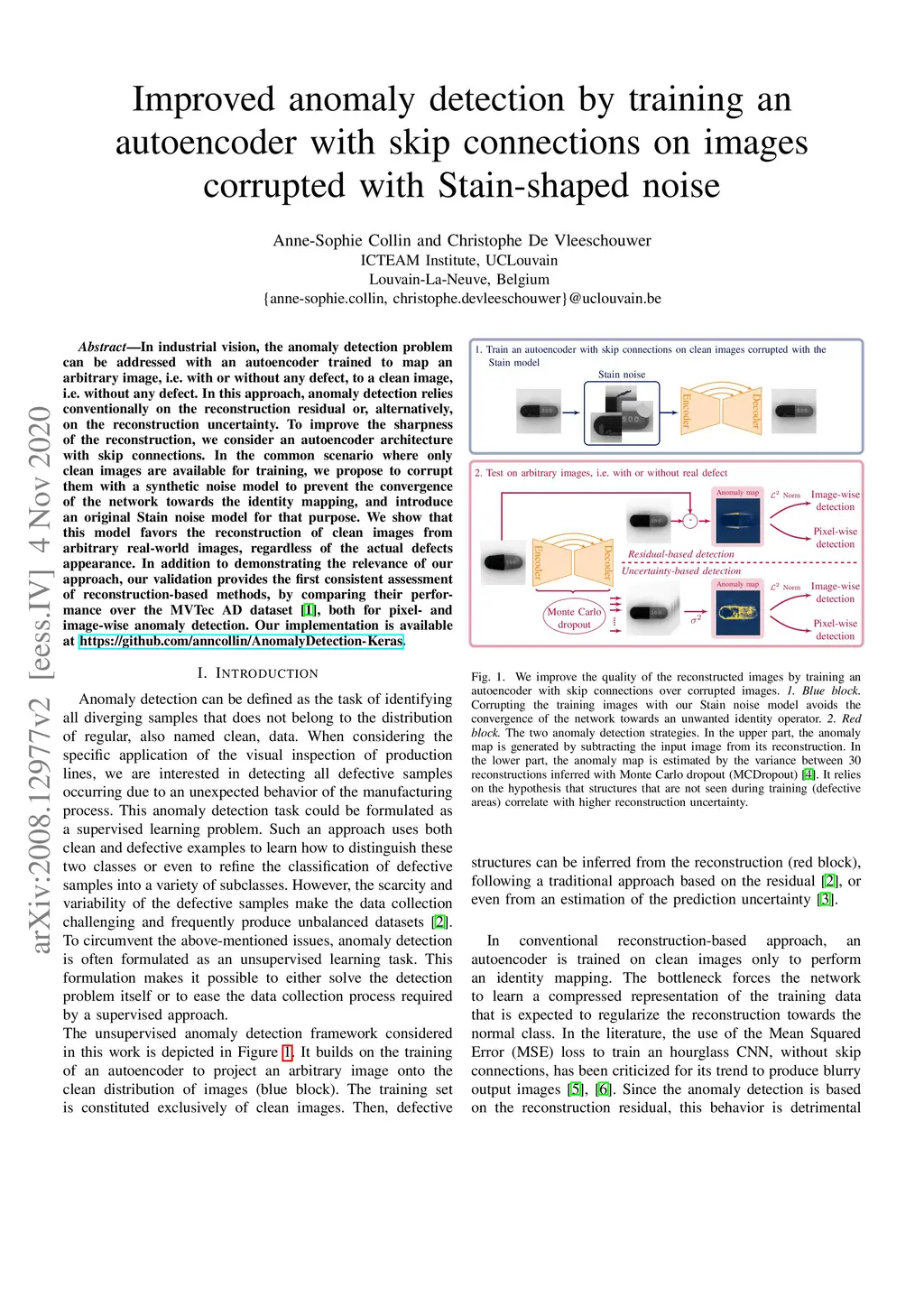 In industrial vision, the anomaly detection problem can be addressed with an autoencoder trained to map an arbitrary image, i.e. with or without any defect, to a clean image, i.e. without any defect. In this approach, anomaly detection relies conventionally on the reconstruction residual or, alternatively, on the reconstruction uncertainty. To improve the sharpness of the reconstruction, we consider an autoencoder architecture with skip connections. In the common scenario where only clean images are available for training, we propose to corrupt them with a synthetic noise model to prevent the convergence of the network towards the identity mapping, and introduce an original Stain noise model for that purpose. We show that this model favors the reconstruction of clean images from arbitrary real-world images, regardless of the actual defects appearance. In addition to demonstrating the relevance of our approach, our validation provides the first consistent assessment of reconstruction-based methods, by comparing their performance over the MVTec AD dataset, both for pixel- and image-wise anomaly detection.