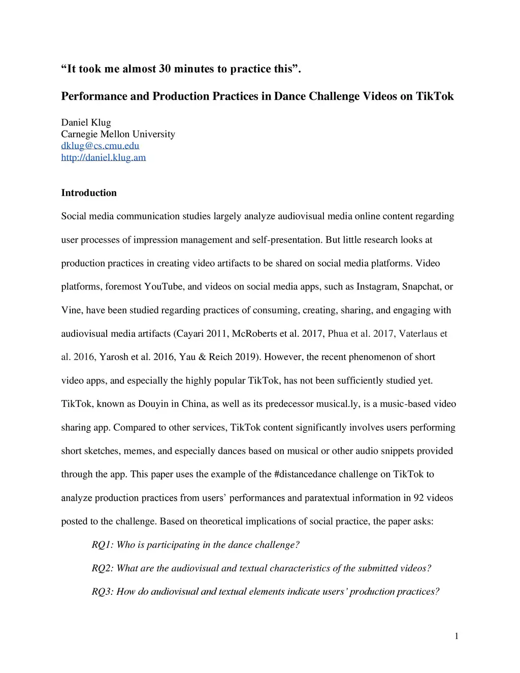 TikTok is a music-based video sharing social media app famous for users creating short meme and dance videos. TikTok videos are largely based on popular song snippets, which is why lip syncing and dance moves evolve as significant user performance practices in videos. User prosumption has not yet been studied regarding the characteristics of TikTok. This paper is based on social practice and performance theory, social media studies, and participatory online video culture. It uses the #distantdance challenge on TikTok to analyze production practices and strategies of users through qualitative video product analysis. 92 videos were coded and categorized regarding their visual content (who participated in which way) and paratextual elements (used tags and captions). The visual and (para-)textual elements were then analyzed regarding indicators that allow to draw conclusions on users' video creation strategies and performance practices in participating in the #distantdance challenge. The results show videos are mainly performed by single white female teenagers wearing casual outfits in their bedrooms. Users shared their experiences about learning and performing the dance in video captions. While users prepared settings and outfits for their performance, the majority of performances seems rather unplanned or spontaneous. This indicates most videos might be part of a series of user attempts to master the dance challenge resulting in posting the first successful video performance to TikTok. In addition to the dance moves, participants also added gestures as closing elements to their performances. This indicates their knowledge of using signals as part of an online community while at the same time manifesting their belongingness to the community. These first results of a qualitative product analysis illustrate some of users' motivations and effort to participate in TikTok dance challenges.
