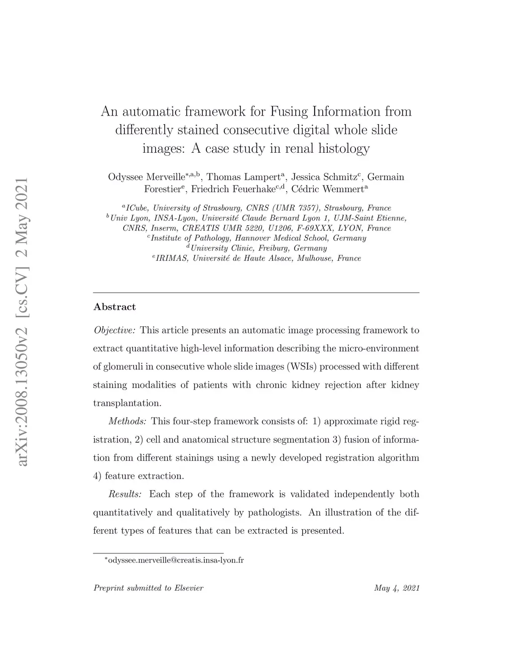 Objective: This article presents an automatic image processing framework to extract quantitative high-level information describing the micro-environment of glomeruli in consecutive whole slide images (WSIs) processed with different staining modalities of patients with chronic kidney rejection after kidney transplantation. Methods: This four-step framework consists of: 1) approximate rigid registration, 2) cell and anatomical structure segmentation 3) fusion of information from different stainings using a newly developed registration algorithm 4) feature extraction. Results: Each step of the framework is validated independently both quantitatively and qualitatively by pathologists. An illustration of the different types of features that can be extracted is presented. Conclusion: The proposed generic framework allows for the analysis of the micro-environment surrounding large structures that can be segmented (either manually or automatically). It is independent of the segmentation approach and is therefore applicable to a variety of biomedical research questions. Significance: Chronic tissue remodelling processes after kidney transplantation can result in interstitial fibrosis and tubular atrophy (IFTA) and glomerulosclerosis. This pipeline provides tools to quantitatively analyse, in the same spatial context, information from different consecutive WSIs and help researchers understand the complex underlying mechanisms leading to IFTA and glomerulosclerosis.