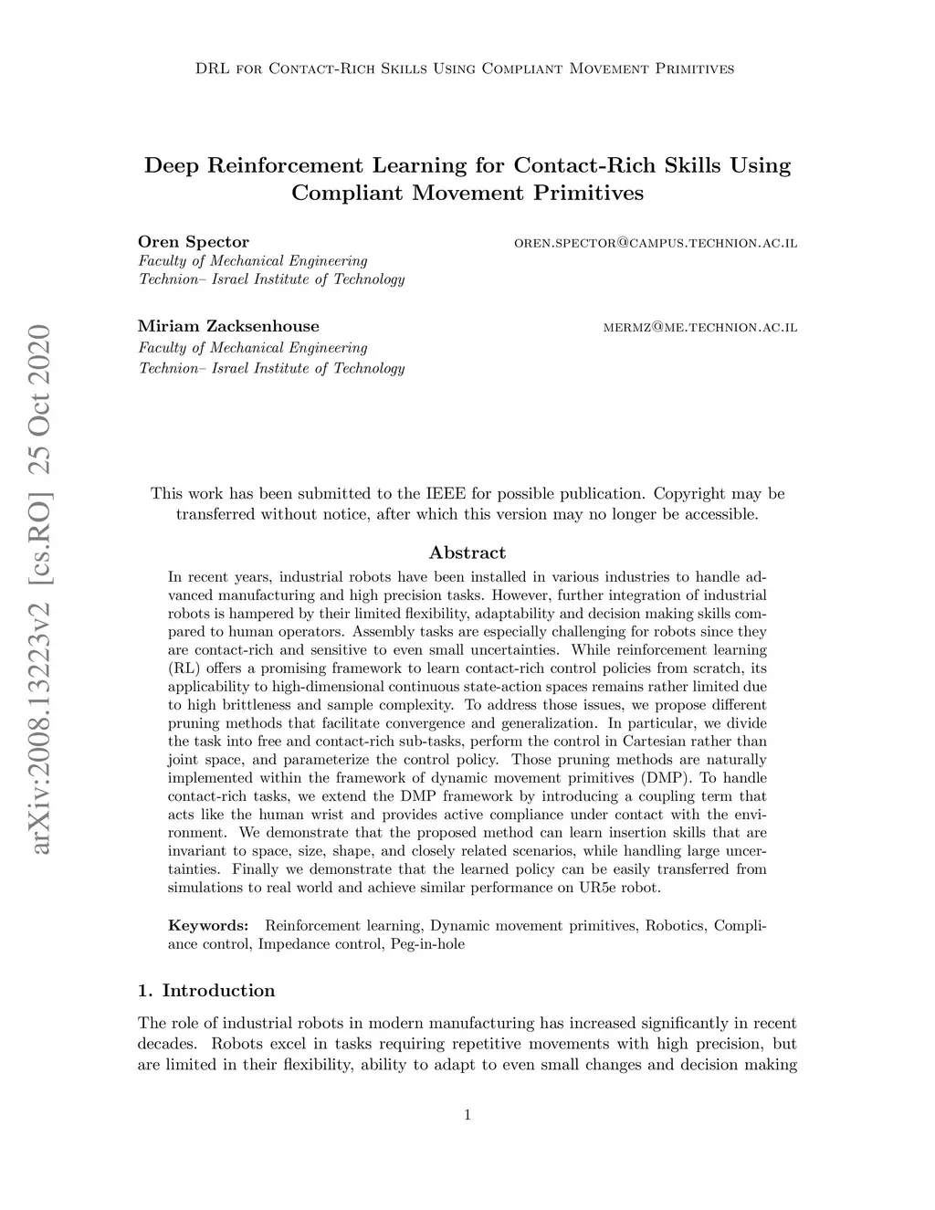 In recent years, industrial robots have been installed in various industries to handle advanced manufacturing and high precision tasks. However, further integration of industrial robots is hampered by their limited flexibility, adaptability and decision making skills compared to human operators. Assembly tasks are especially challenging for robots since they are contact-rich and sensitive to even small uncertainties. While reinforcement learning (RL) offers a promising framework to learn contact-rich control policies from scratch, its applicability to high-dimensional continuous state-action spaces remains rather limited due to high brittleness and sample complexity. To address those issues, we propose different pruning methods that facilitate convergence and generalization. In particular, we divide the task into free and contact-rich sub-tasks, perform the control in Cartesian rather than joint space, and parameterize the control policy. Those pruning methods are naturally implemented within the framework of dynamic movement primitives (DMP). To handle contact-rich tasks, we extend the DMP framework by introducing a coupling term that acts like the human wrist and provides active compliance under contact with the environment. We demonstrate that the proposed method can learn insertion skills that are invariant to space, size, shape, and closely related scenarios, while handling large uncertainties. Finally we demonstrate that the learned policy can be easily transferred from simulations to real world and achieve similar performance on UR5e robot.