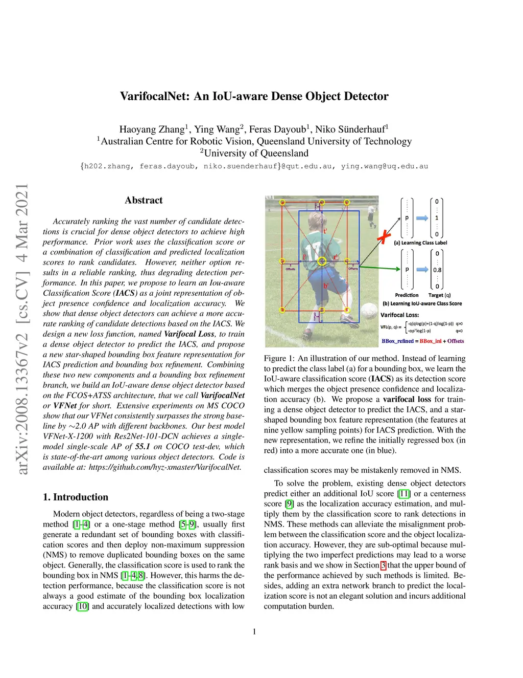 Accurately ranking the vast number of candidate detections is crucial for dense object detectors to achieve high performance. Prior work uses the classification score or a combination of classification and predicted localization scores to rank candidates. However, neither option results in a reliable ranking, thus degrading detection performance. In this paper, we propose to learn an Iou-aware Classification Score (IACS) as a joint representation of object presence confidence and localization accuracy. We show that dense object detectors can achieve a more accurate ranking of candidate detections based on the IACS. We design a new loss function, named Varifocal Loss, to train a dense object detector to predict the IACS, and propose a new star-shaped bounding box feature representation for IACS prediction and bounding box refinement. Combining these two new components and a bounding box refinement branch, we build an IoU-aware dense object detector based on the FCOS+ATSS architecture, that we call VarifocalNet or VFNet for short. Extensive experiments on MS COCO show that our VFNet consistently surpasses the strong baseline by 2.0 AP with different backbones. Our best model VFNet-X-1200 with Res2Net-101-DCN achieves a single-model single-scale AP of 55.1 on COCO test-dev, which is state-of-the-art among various object detectors.Code is available at https://github.com/hyz-xmaster/VarifocalNet .