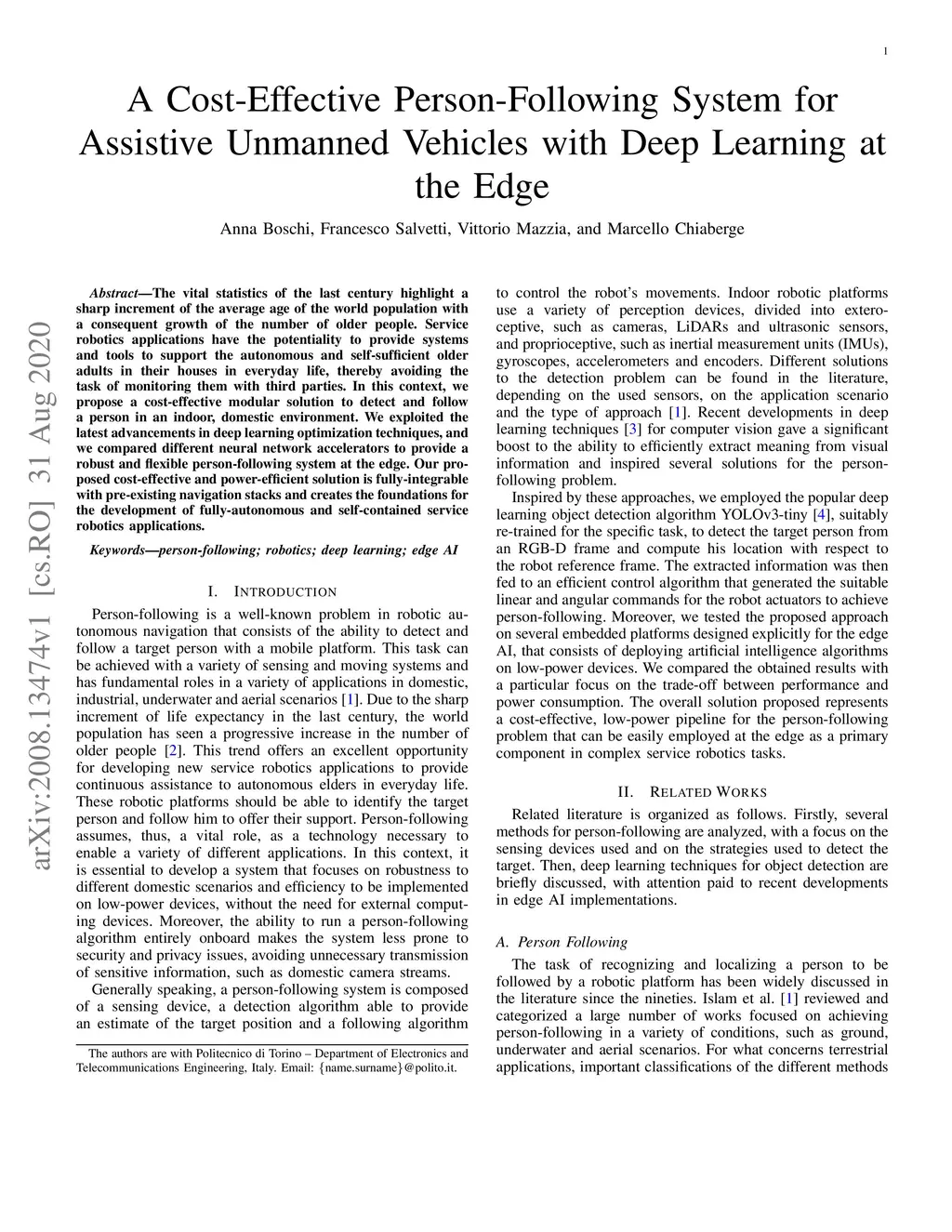 The vital statistics of the last century highlight a sharp increment of the average age of the world population with a consequent growth of the number of older people. Service robotics applications have the potentiality to provide systems and tools to support the autonomous and self-sufficient older adults in their houses in everyday life, thereby avoiding the task of monitoring them with third parties. In this context, we propose a cost-effective modular solution to detect and follow a person in an indoor, domestic environment. We exploited the latest advancements in deep learning optimization techniques, and we compared different neural network accelerators to provide a robust and flexible person-following system at the edge. Our proposed cost-effective and power-efficient solution is fully-integrable with pre-existing navigation stacks and creates the foundations for the development of fully-autonomous and self-contained service robotics applications.