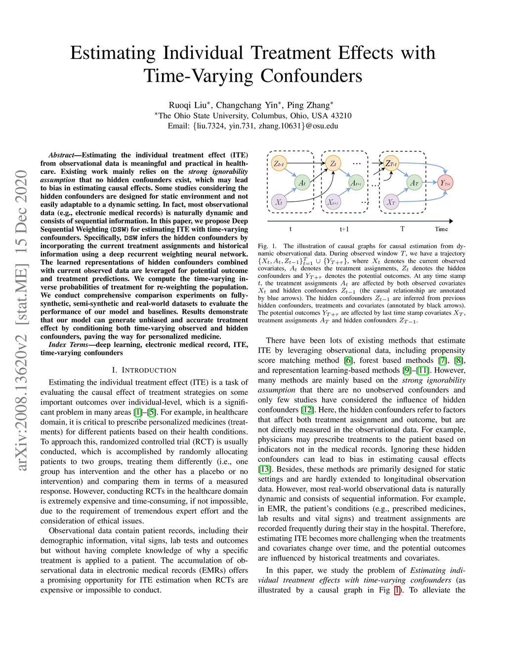 Estimating the individual treatment effect (ITE) from observational data is meaningful and practical in healthcare. Existing work mainly relies on the strong ignorability assumption that no hidden confounders exist, which may lead to bias in estimating causal effects. Some studies consider the hidden confounders are designed for static environment and not easily adaptable to a dynamic setting. In fact, most observational data (e.g., electronic medical records) is naturally dynamic and consists of sequential information. In this paper, we propose Deep Sequential Weighting (DSW) for estimating ITE with time-varying confounders. Specifically, DSW infers the hidden confounders by incorporating the current treatment assignments and historical information using a deep recurrent weighting neural network. The learned representations of hidden confounders combined with current observed data are leveraged for potential outcome and treatment predictions. We compute the time-varying inverse probabilities of treatment for re-weighting the population. We conduct comprehensive comparison experiments on fully-synthetic, semi-synthetic and real-world datasets to evaluate the performance of our model and baselines. Results demonstrate that our model can generate unbiased and accurate treatment effect by conditioning both time-varying observed and hidden confounders, paving the way for personalized medicine.
