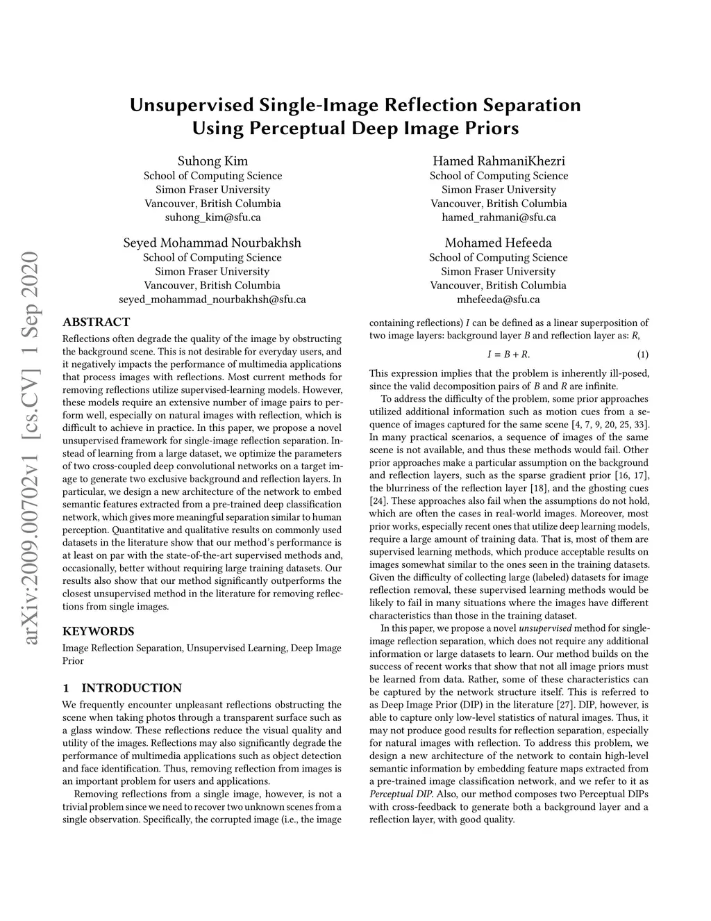 Unsupervised Single-Image Reflection Separation Using Perceptual Deep