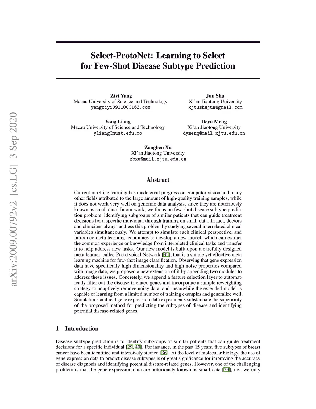 Current machine learning has made great progress on computer vision and many other fields attributed to the large amount of high-quality training samples, while it does not work very well on genomic data analysis, since they are notoriously known as small data. In our work, we focus on few-shot disease subtype prediction problem, identifying subgroups of similar patients that can guide treatment decisions for a specific individual through training on small data. In fact, doctors and clinicians always address this problem by studying several interrelated clinical variables simultaneously. We attempt to simulate such clinical perspective, and introduce meta learning techniques to develop a new model, which can extract the common experience or knowledge from interrelated clinical tasks and transfer it to help address new tasks. Our new model is built upon a carefully designed meta-learner, called Prototypical Network, that is a simple yet effective meta learning machine for few-shot image classification. Observing that gene expression data have specifically high dimensionality and high noise properties compared with image data, we proposed a new extension of it by appending two modules to address these issues. Concretely, we append a feature selection layer to automatically filter out the disease-irrelated genes and incorporate a sample reweighting strategy to adaptively remove noisy data, and meanwhile the extended model is capable of learning from a limited number of training examples and generalize well. Simulations and real gene expression data experiments substantiate the superiority of the proposed method for predicting the subtypes of disease and identifying potential disease-related genes.