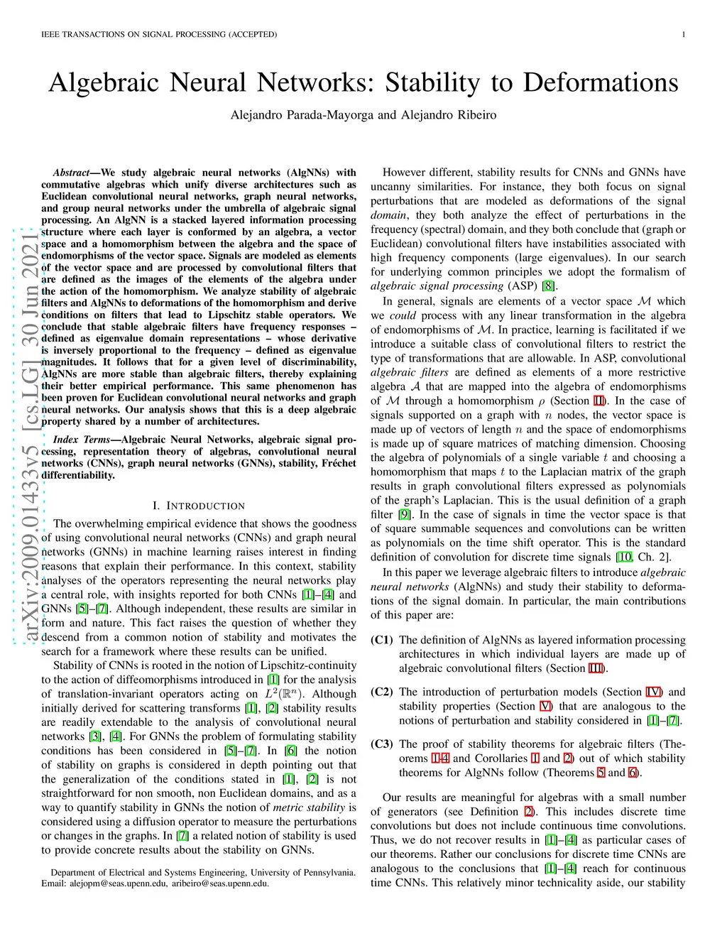 We study algebraic neural networks (AlgNNs) with commutative algebras which unify diverse architectures such as Euclidean convolutional neural networks, graph neural networks, and group neural networks under the umbrella of algebraic signal processing. An AlgNN is a stacked layered information processing structure where each layer is conformed by an algebra, a vector space and a homomorphism between the algebra and the space of endomorphisms of the vector space. Signals are modeled as elements of the vector space and are processed by convolutional filters that are defined as the images of the elements of the algebra under the action of the homomorphism. We analyze stability of algebraic filters and AlgNNs to deformations of the homomorphism and derive conditions on filters that lead to Lipschitz stable operators. We conclude that stable algebraic filters have frequency responses -- defined as eigenvalue domain representations -- whose derivative is inversely proportional to the frequency -- defined as eigenvalue magnitudes. It follows that for a given level of discriminability, AlgNNs are more stable than algebraic filters, thereby explaining their better empirical performance. This same phenomenon has been proven for Euclidean convolutional neural networks and graph neural networks. Our analysis shows that this is a deep algebraic property shared by a number of architectures.
