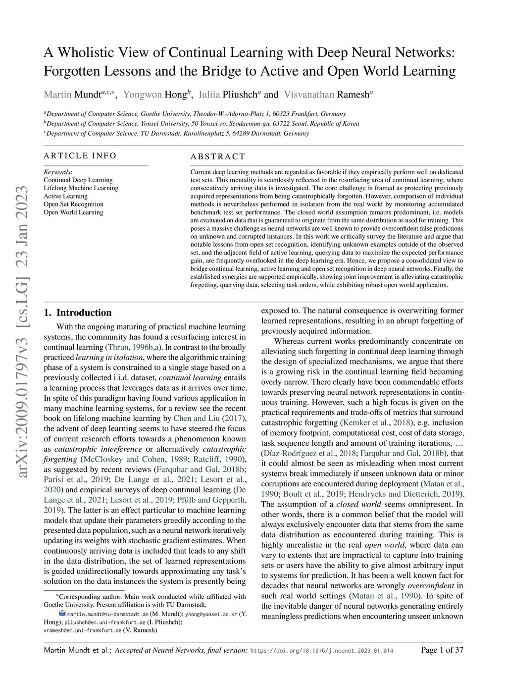 Current deep learning methods are regarded as favorable if they empirically perform well on dedicated test sets. This mentality is seamlessly reflected in the resurfacing area of continual learning, where consecutively arriving data is investigated. The core challenge is framed as protecting previously acquired representations from being catastrophically forgotten. However, comparison of individual methods is nevertheless performed in isolation from the real world by monitoring accumulated benchmark test set performance. The closed world assumption remains predominant, i.e. models are evaluated on data that is guaranteed to originate from the same distribution as used for training. This poses a massive challenge as neural networks are well known to provide overconfident false predictions on unknown and corrupted instances. In this work we critically survey the literature and argue that notable lessons from open set recognition, identifying unknown examples outside of the observed set, and the adjacent field of active learning, querying data to maximize the expected performance gain, are frequently overlooked in the deep learning era. Hence, we propose a consolidated view to bridge continual learning, active learning and open set recognition in deep neural networks. Finally, the established synergies are supported empirically, showing joint improvement in alleviating catastrophic forgetting, querying data, selecting task orders, while exhibiting robust open world application.