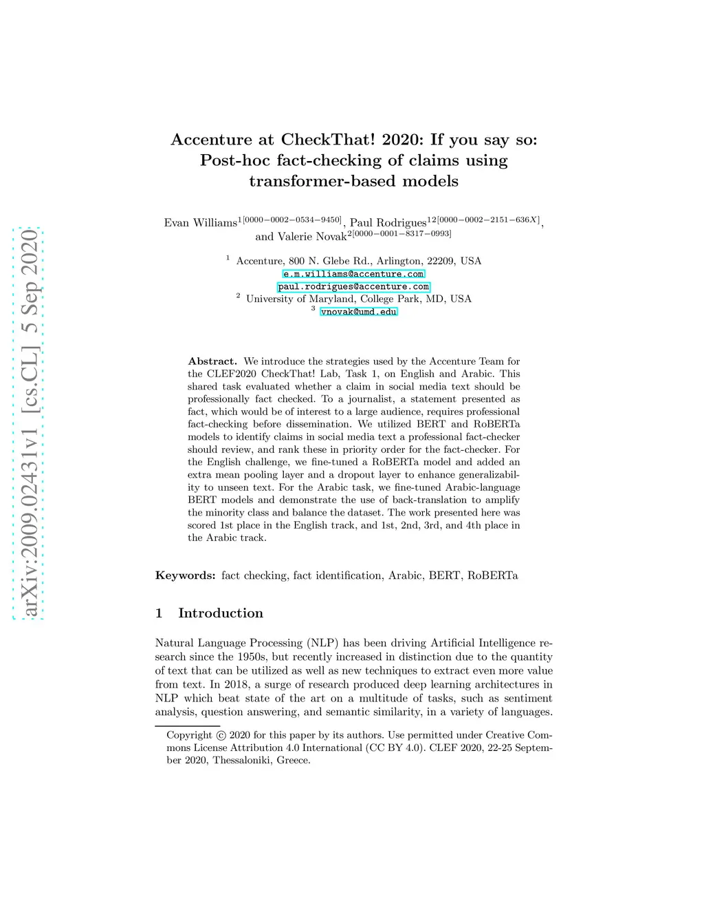 We introduce the strategies used by the Accenture Team for the CLEF2020 CheckThat! Lab, Task 1, on English and Arabic. This shared task evaluated whether a claim in social media text should be professionally fact checked. To a journalist, a statement presented as fact, which would be of interest to a large audience, requires professional fact-checking before dissemination. We utilized BERT and RoBERTa models to identify claims in social media text a professional fact-checker should review, and rank these in priority order for the fact-checker. For the English challenge, we fine-tuned a RoBERTa model and added an extra mean pooling layer and a dropout layer to enhance generalizability to unseen text. For the Arabic task, we fine-tuned Arabic-language BERT models and demonstrate the use of back-translation to amplify the minority class and balance the dataset. The work presented here was scored 1st place in the English track, and 1st, 2nd, 3rd, and 4th place in the Arabic track.