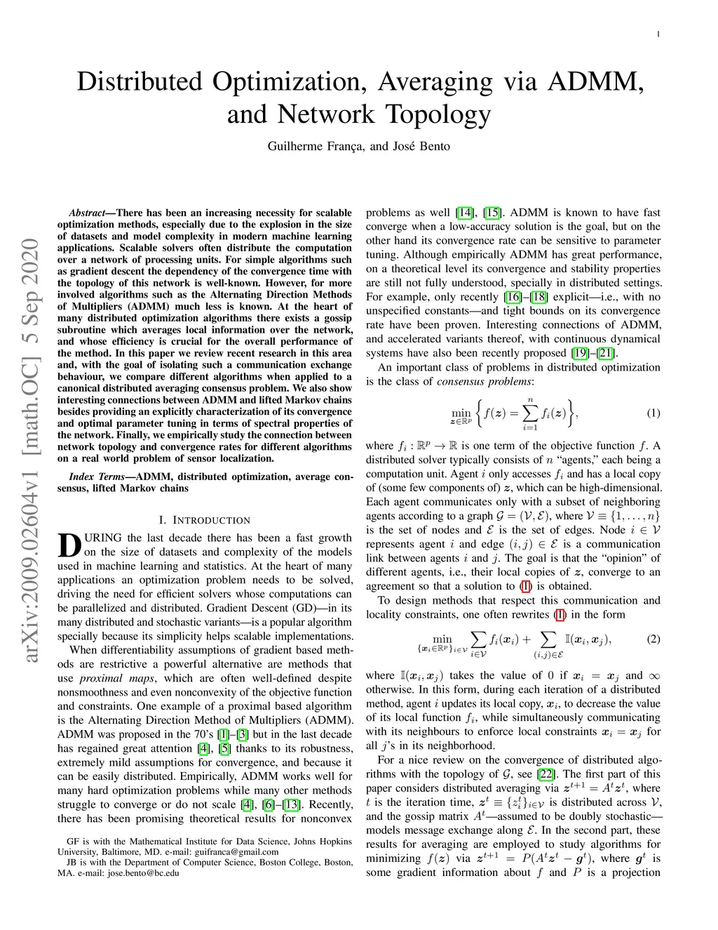 There has been an increasing necessity for scalable optimization methods, especially due to the explosion in the size of datasets and model complexity in modern machine learning applications. Scalable solvers often distribute the computation over a network of processing units. For simple algorithms such as gradient descent the dependency of the convergence time with the topology of this network is well-known. However, for more involved algorithms such as the Alternating Direction Methods of Multipliers (ADMM) much less is known. At the heart of many distributed optimization algorithms there exists a gossip subroutine which averages local information over the network, and whose efficiency is crucial for the overall performance of the method. In this paper we review recent research in this area and, with the goal of isolating such a communication exchange behaviour, we compare different algorithms when applied to a canonical distributed averaging consensus problem. We also show interesting connections between ADMM and lifted Markov chains besides providing an explicitly characterization of its convergence and optimal parameter tuning in terms of spectral properties of the network. Finally, we empirically study the connection between network topology and convergence rates for different algorithms on a real world problem of sensor localization.