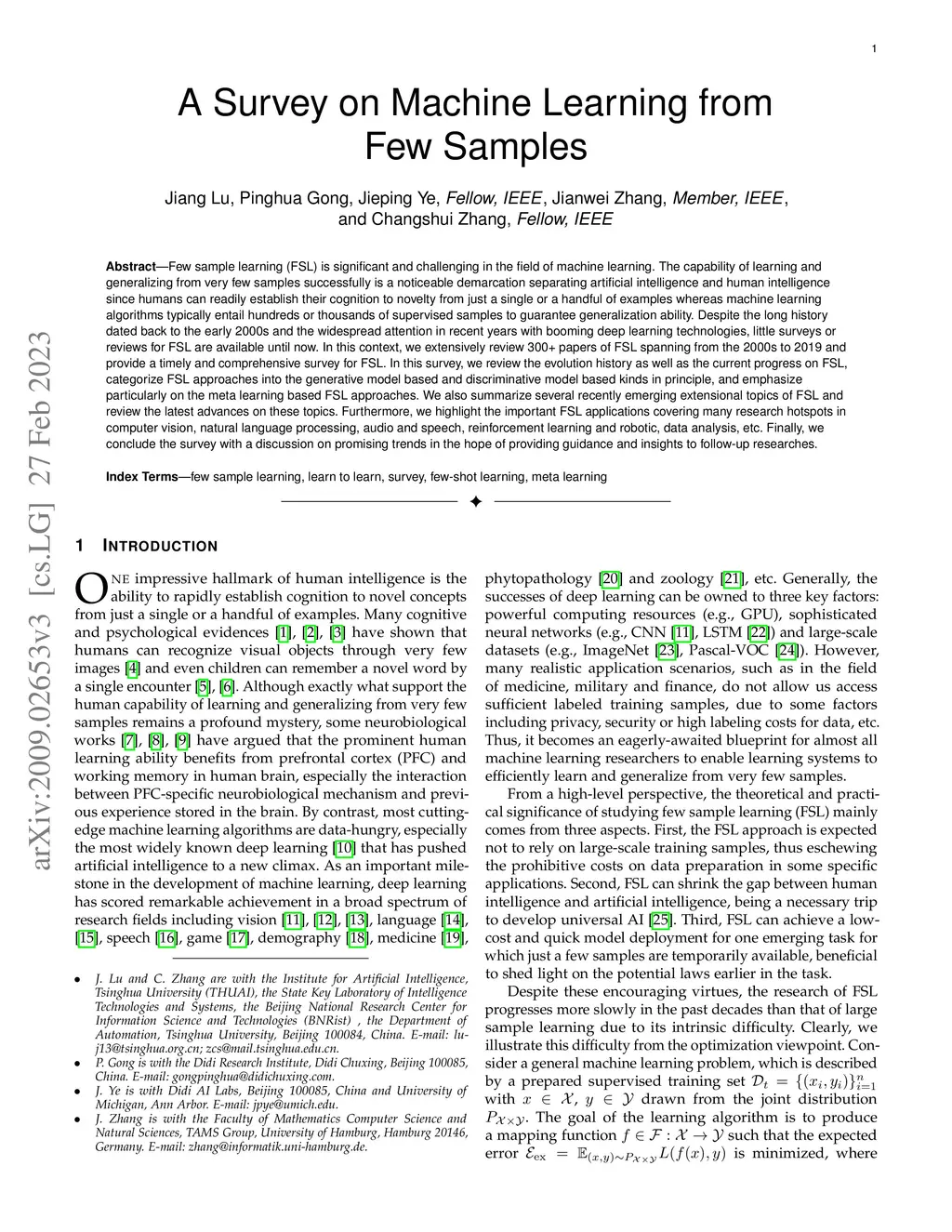 Few sample learning (FSL) is significant and challenging in the field of machine learning. The capability of learning and generalizing from very few samples successfully is a noticeable demarcation separating artificial intelligence and human intelligence since humans can readily establish their cognition to novelty from just a single or a handful of examples whereas machine learning algorithms typically entail hundreds or thousands of supervised samples to guarantee generalization ability. Despite the long history dated back to the early 2000s and the widespread attention in recent years with booming deep learning technologies, little surveys or reviews for FSL are available until now. In this context, we extensively review 300+ papers of FSL spanning from the 2000s to 2019 and provide a timely and comprehensive survey for FSL. In this survey, we review the evolution history as well as the current progress on FSL, categorize FSL approaches into the generative model based and discriminative model based kinds in principle, and emphasize particularly on the meta learning based FSL approaches. We also summarize several recently emerging extensional topics of FSL and review the latest advances on these topics. Furthermore, we highlight the important FSL applications covering many research hotspots in computer vision, natural language processing, audio and speech, reinforcement learning and robotic, data analysis, etc. Finally, we conclude the survey with a discussion on promising trends in the hope of providing guidance and insights to follow-up researches.