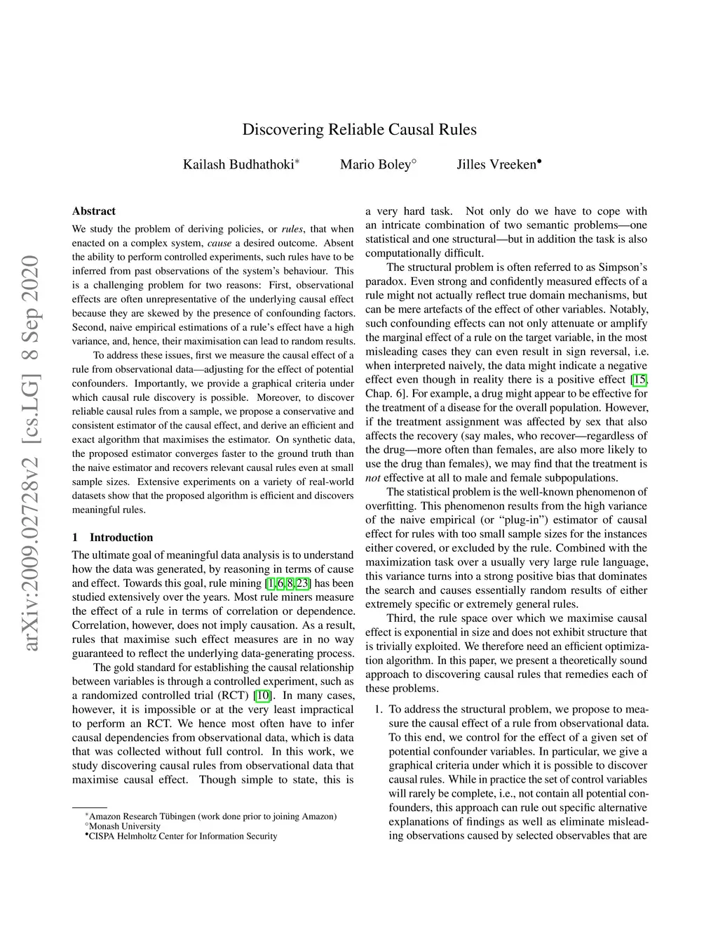 We study the problem of deriving policies, or rules, that when enacted on a complex system, cause a desired outcome. Absent the ability to perform controlled experiments, such rules have to be inferred from past observations of the system's behaviour. This is a challenging problem for two reasons: First, observational effects are often unrepresentative of the underlying causal effect because they are skewed by the presence of confounding factors. Second, naive empirical estimations of a rule's effect have a high variance, and, hence, their maximisation can lead to random results. To address these issues, first we measure the causal effect of a rule from observational data---adjusting for the effect of potential confounders. Importantly, we provide a graphical criteria under which causal rule discovery is possible. Moreover, to discover reliable causal rules from a sample, we propose a conservative and consistent estimator of the causal effect, and derive an efficient and exact algorithm that maximises the estimator. On synthetic data, the proposed estimator converges faster to the ground truth than the naive estimator and recovers relevant causal rules even at small sample sizes. Extensive experiments on a variety of real-world datasets show that the proposed algorithm is efficient and discovers meaningful rules.