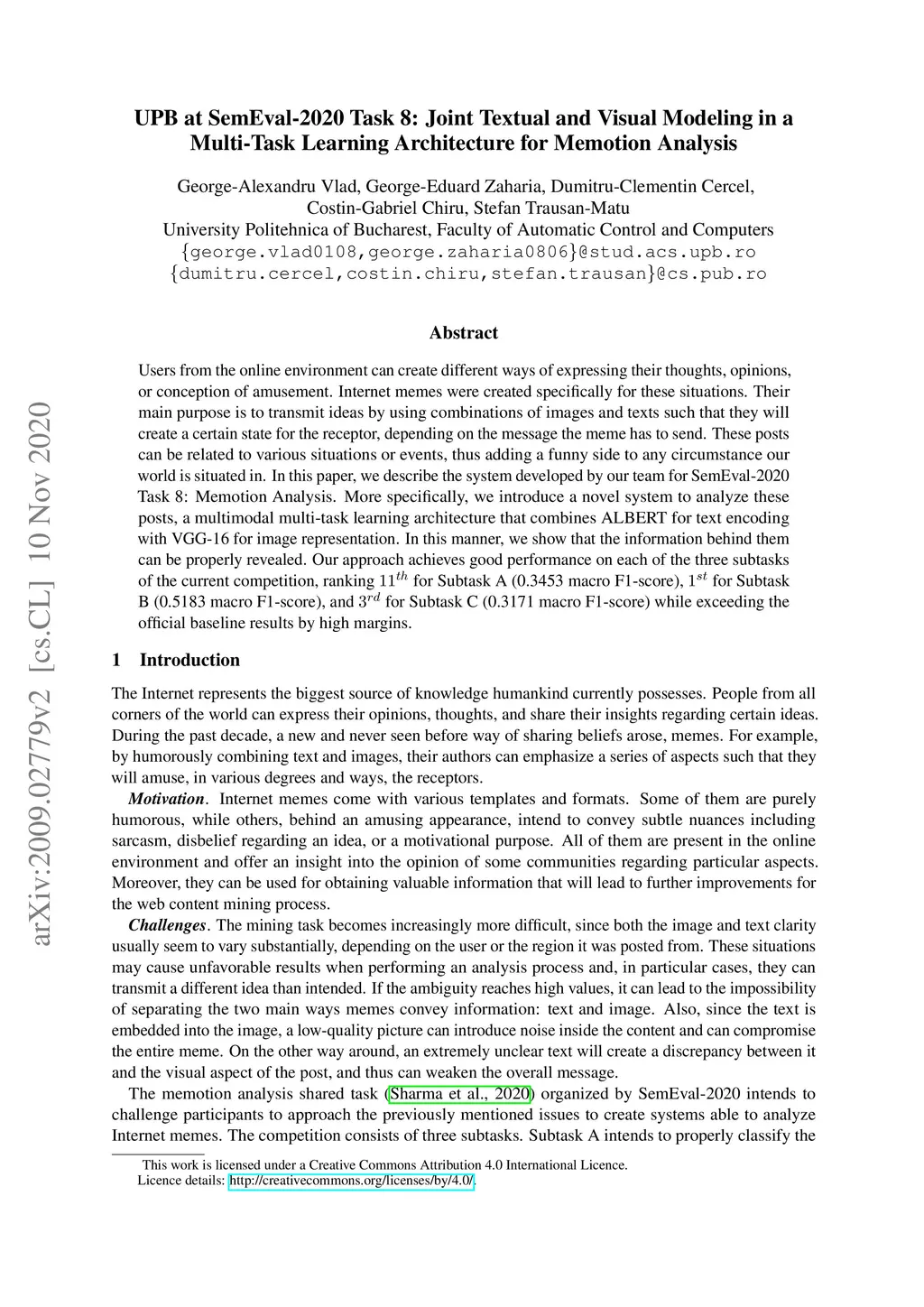 Users from the online environment can create different ways of expressing their thoughts, opinions, or conception of amusement. Internet memes were created specifically for these situations. Their main purpose is to transmit ideas by using combinations of images and texts such that they will create a certain state for the receptor, depending on the message the meme has to send. These posts can be related to various situations or events, thus adding a funny side to any circumstance our world is situated in. In this paper, we describe the system developed by our team for SemEval-2020 Task 8: Memotion Analysis. More specifically, we introduce a novel system to analyze these posts, a multimodal multi-task learning architecture that combines ALBERT for text encoding with VGG-16 for image representation. In this manner, we show that the information behind them can be properly revealed. Our approach achieves good performance on each of the three subtasks of the current competition, ranking 11th for Subtask A (0.3453 macro F1-score), 1st for Subtask B (0.5183 macro F1-score), and 3rd for Subtask C (0.3171 macro F1-score) while exceeding the official baseline results by high margins.