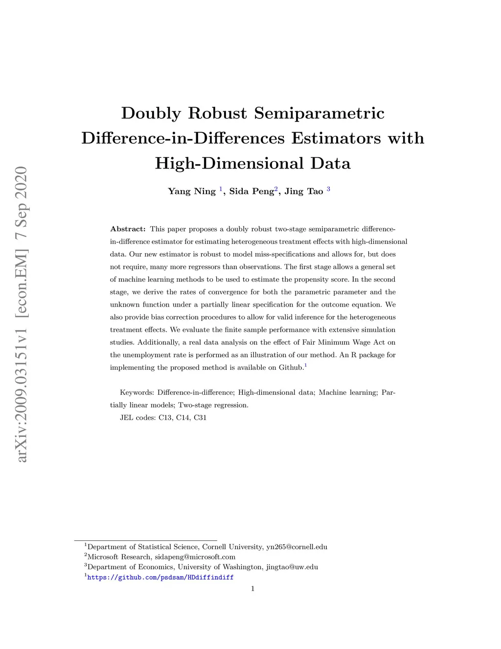 This paper proposes a doubly robust two-stage semiparametric difference-in-difference estimator for estimating heterogeneous treatment effects with high-dimensional data. Our new estimator is robust to model miss-specifications and allows for, but does not require, many more regressors than observations. The first stage allows a general set of machine learning methods to be used to estimate the propensity score. In the second stage, we derive the rates of convergence for both the parametric parameter and the unknown function under a partially linear specification for the outcome equation. We also provide bias correction procedures to allow for valid inference for the heterogeneous treatment effects. We evaluate the finite sample performance with extensive simulation studies. Additionally, a real data analysis on the effect of Fair Minimum Wage Act on the unemployment rate is performed as an illustration of our method. An R package for implementing the proposed method is available on Github.