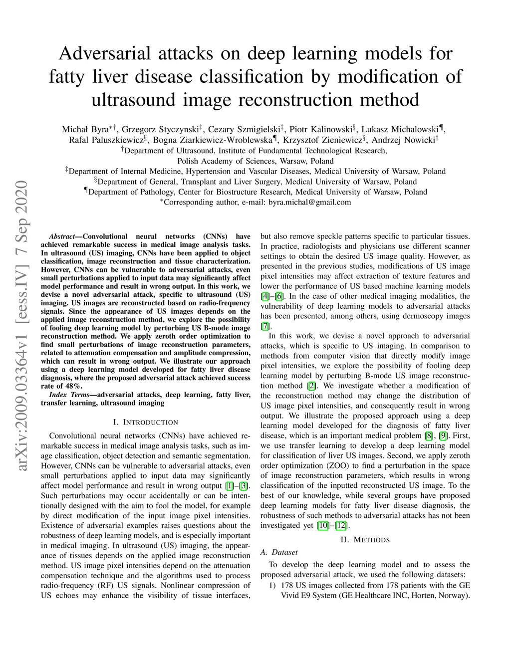 Convolutional neural networks (CNNs) have achieved remarkable success in medical image analysis tasks. In ultrasound (US) imaging, CNNs have been applied to object classification, image reconstruction and tissue characterization. However, CNNs can be vulnerable to adversarial attacks, even small perturbations applied to input data may significantly affect model performance and result in wrong output. In this work, we devise a novel adversarial attack, specific to ultrasound (US) imaging. US images are reconstructed based on radio-frequency signals. Since the appearance of US images depends on the applied image reconstruction method, we explore the possibility of fooling deep learning model by perturbing US B-mode image reconstruction method. We apply zeroth order optimization to find small perturbations of image reconstruction parameters, related to attenuation compensation and amplitude compression, which can result in wrong output. We illustrate our approach using a deep learning model developed for fatty liver disease diagnosis, where the proposed adversarial attack achieved success rate of 48%.