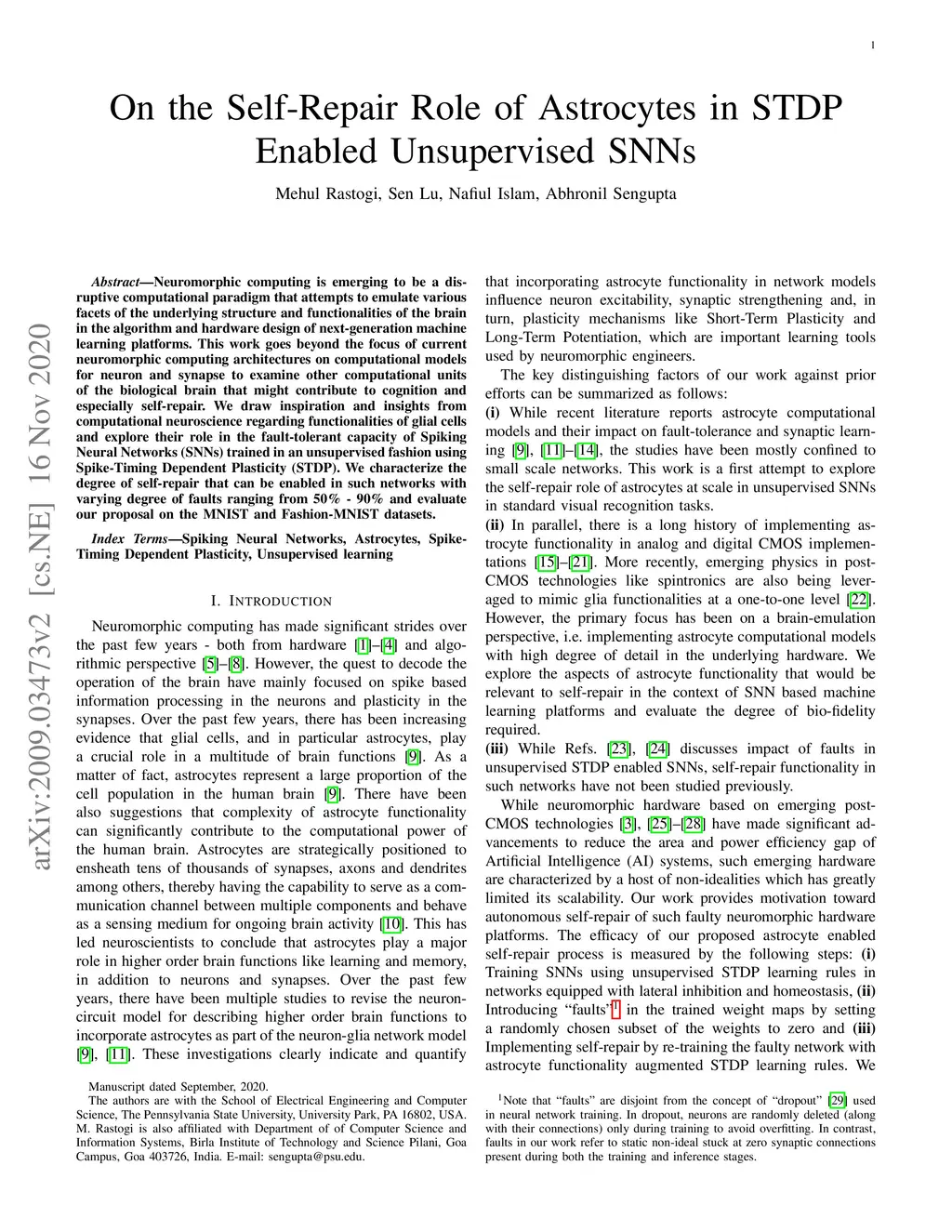 Neuromorphic computing is emerging to be a disruptive computational paradigm that attempts to emulate various facets of the underlying structure and functionalities of the brain in the algorithm and hardware design of next-generation machine learning platforms. This work goes beyond the focus of current neuromorphic computing architectures on computational models for neuron and synapse to examine other computational units of the biological brain that might contribute to cognition and especially self-repair. We draw inspiration and insights from computational neuroscience regarding functionalities of glial cells and explore their role in the fault-tolerant capacity of Spiking Neural Networks (SNNs) trained in an unsupervised fashion using Spike-Timing Dependent Plasticity (STDP). We characterize the degree of self-repair that can be enabled in such networks with varying degree of faults ranging from 50% - 90% and evaluate our proposal on the MNIST and Fashion-MNIST datasets.