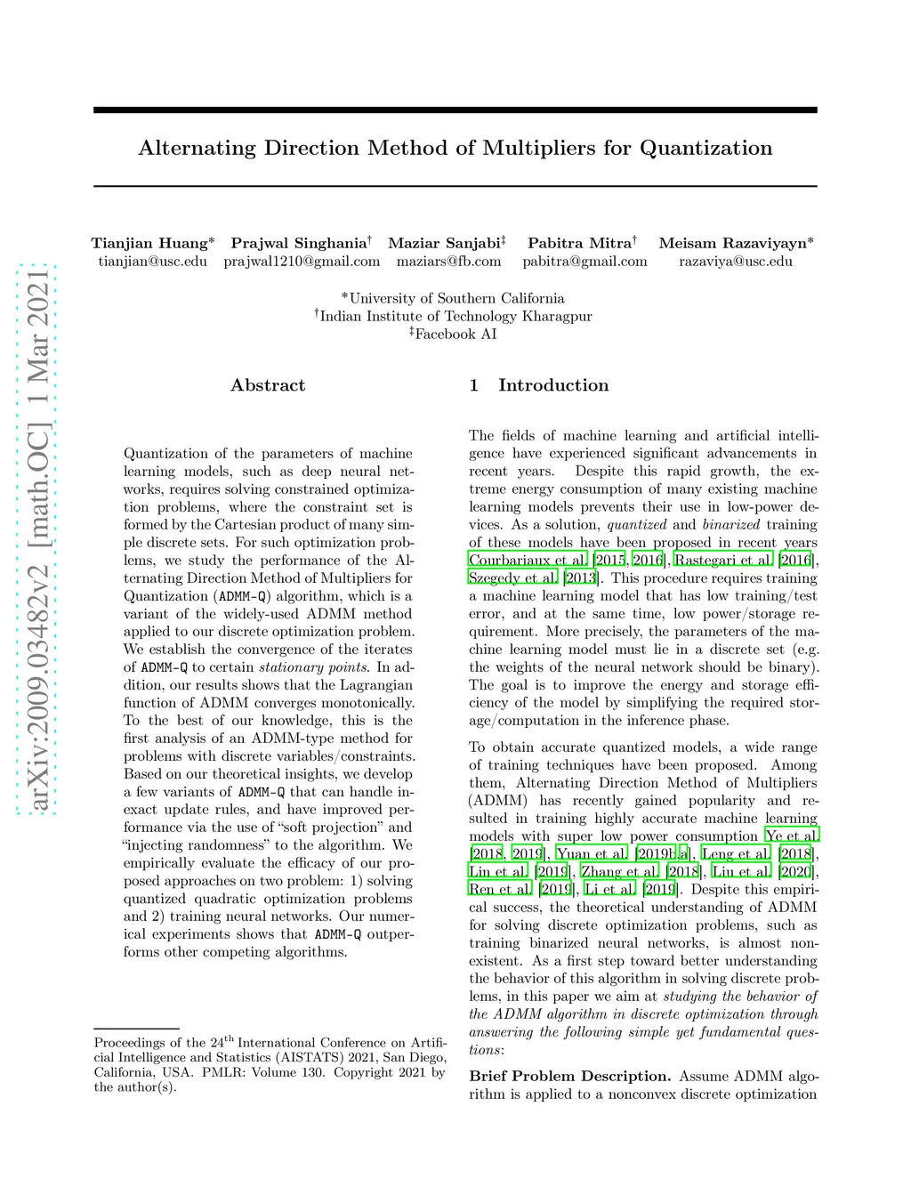 Quantization of the parameters of machine learning models, such as deep neural networks, requires solving constrained optimization problems, where the constraint set is formed by the Cartesian product of many simple discrete sets. For such optimization problems, we study the performance of the Alternating Direction Method of Multipliers for Quantization () algorithm, which is a variant of the widely-used ADMM method applied to our discrete optimization problem. We establish the convergence of the iterates of to certain . To the best of our knowledge, this is the first analysis of an ADMM-type method for problems with discrete variables/constraints. Based on our theoretical insights, we develop a few variants of that can handle inexact update rules, and have improved performance via the use of "soft projection" and "injecting randomness to the algorithm". We empirically evaluate the efficacy of our proposed approaches.