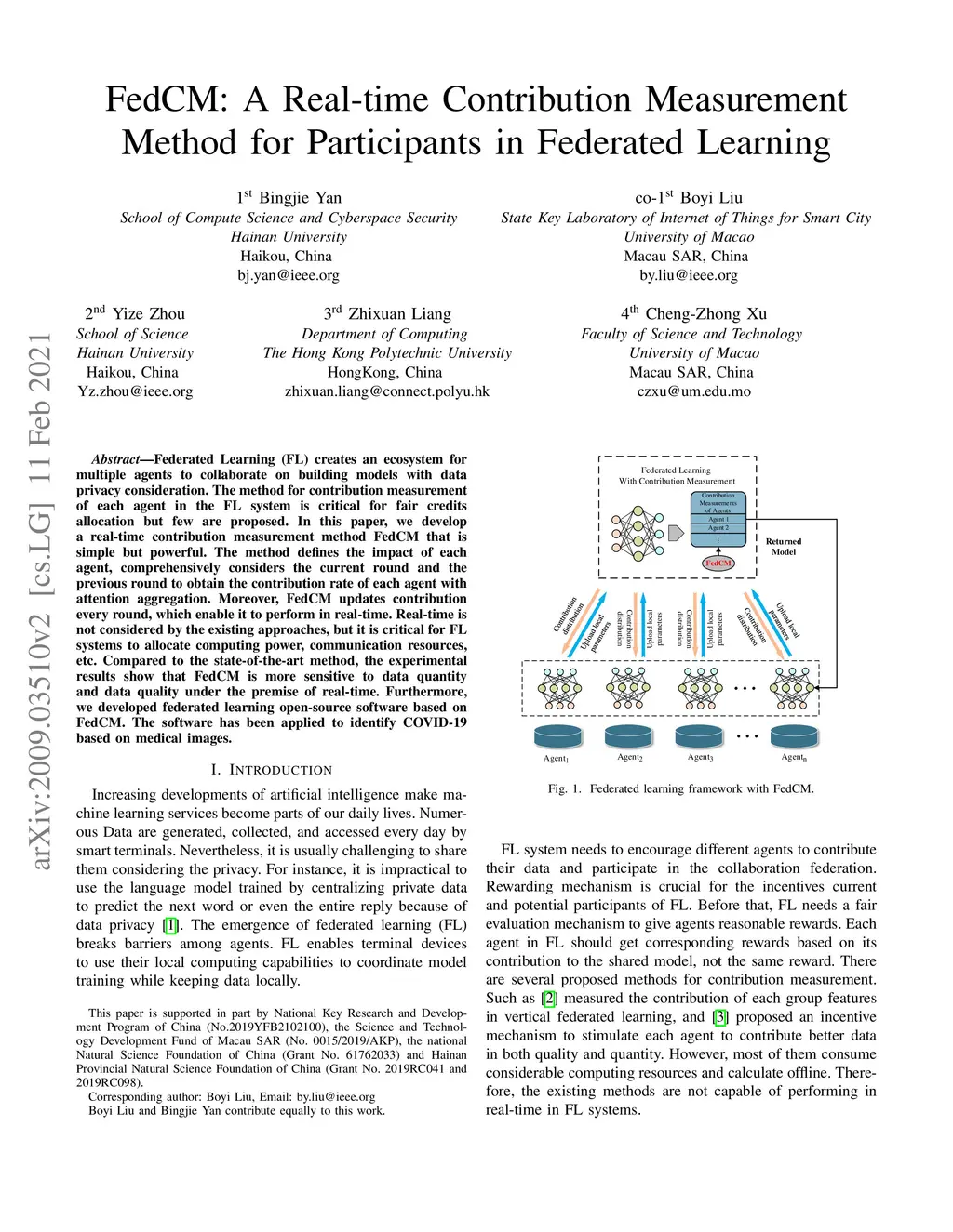Federated Learning (FL) creates an ecosystem for multiple agents to collaborate on building models with data privacy consideration. The method for contribution measurement of each agent in the FL system is critical for fair credits allocation but few are proposed. In this paper, we develop a real-time contribution measurement method FedCM that is simple but powerful. The method defines the impact of each agent, comprehensively considers the current round and the previous round to obtain the contribution rate of each agent with attention aggregation. Moreover, FedCM updates contribution every round, which enable it to perform in real-time. Real-time is not considered by the existing approaches, but it is critical for FL systems to allocate computing power, communication resources, etc. Compared to the state-of-the-art method, the experimental results show that FedCM is more sensitive to data quantity and data quality under the premise of real-time. Furthermore, we developed federated learning open-source software based on FedCM. The software has been applied to identify COVID-19 based on medical images.