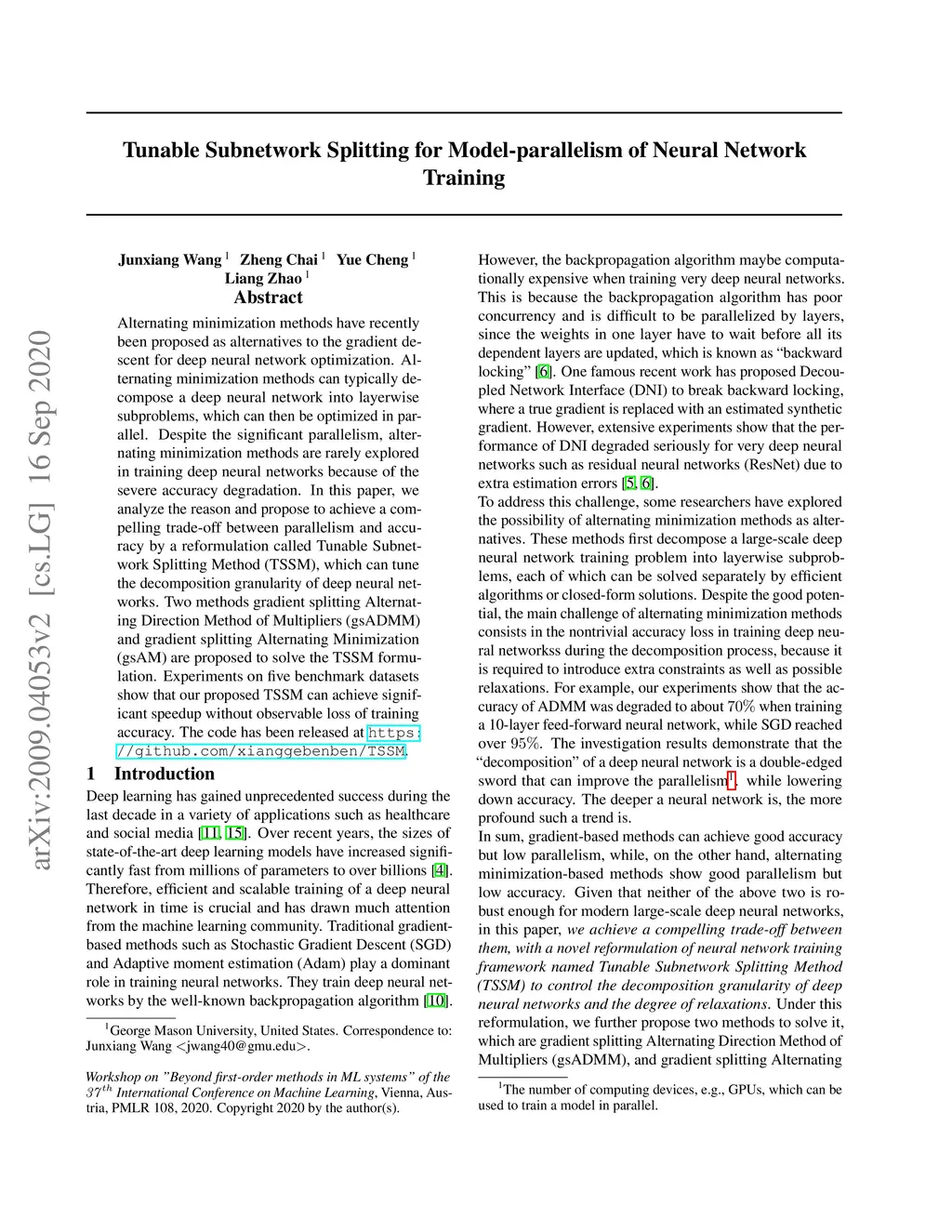 Alternating minimization methods have recently been proposed as alternatives to the gradient descent for deep neural network optimization. Alternating minimization methods can typically decompose a deep neural network into layerwise subproblems, which can then be optimized in parallel. Despite the significant parallelism, alternating minimization methods are rarely explored in training deep neural networks because of the severe accuracy degradation. In this paper, we analyze the reason and propose to achieve a compelling trade-off between parallelism and accuracy by a reformulation called Tunable Subnetwork Splitting Method (TSSM), which can tune the decomposition granularity of deep neural networks. Two methods gradient splitting Alternating Direction Method of Multipliers (gsADMM) and gradient splitting Alternating Minimization (gsAM) are proposed to solve the TSSM formulation. Experiments on five benchmark datasets show that our proposed TSSM can achieve significant speedup without observable loss of training accuracy. The code has been released at https://github.com/xianggebenben/TSSM.