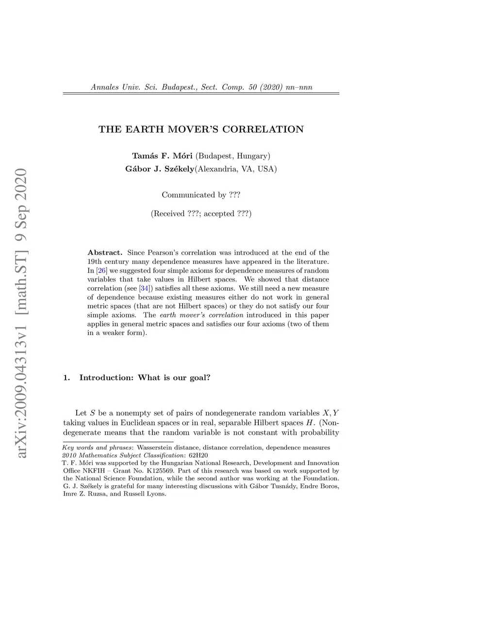 Since Pearson's correlation was introduced at the end of the 19th century many dependence measures have appeared in the literature. Recently we have suggested four simple axioms for dependence measures of random variables that take values in Hilbert spaces. We showed that distance correlation satisfies all these axioms. We still need a new measure of dependence because existing measures either do not work in general metric spaces (that are not Hilbert spaces) or they do not satisfy our four simple axioms. The earth mover's correlation introduced in this paper applies in general metric spaces and satisfies our four axioms (two of them in a weaker form).