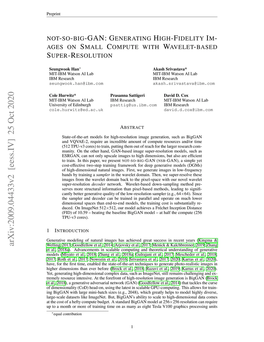 State-of-the-art models for high-resolution image generation, such as BigGAN and VQVAE-2, require an incredible amount of compute resources and/or time (512 TPU-v3 cores) to train, putting them out of reach for the larger research community. On the other hand, GAN-based image super-resolution models, such as ESRGAN, can not only upscale images to high dimensions, but also are efficient to train. In this paper, we present not-so-big-GAN (nsb-GAN), a simple yet cost-effective two-step training framework for deep generative models (DGMs) of high-dimensional natural images. First, we generate images in low-frequency bands by training a sampler in the wavelet domain. Then, we super-resolve these images from the wavelet domain back to the pixel-space with our novel wavelet super-resolution decoder network. Wavelet-based down-sampling method preserves more structural information than pixel-based methods, leading to significantly better generative quality of the low-resolution sampler (e.g., 64x64). Since the sampler and decoder can be trained in parallel and operate on much lower dimensional spaces than end-to-end models, the training cost is substantially reduced. On ImageNet 512x512, our model achieves a Fr\échet Inception Distance (FID) of 10.59 -- beating the baseline BigGAN model -- at half the compute (256 TPU-v3 cores).