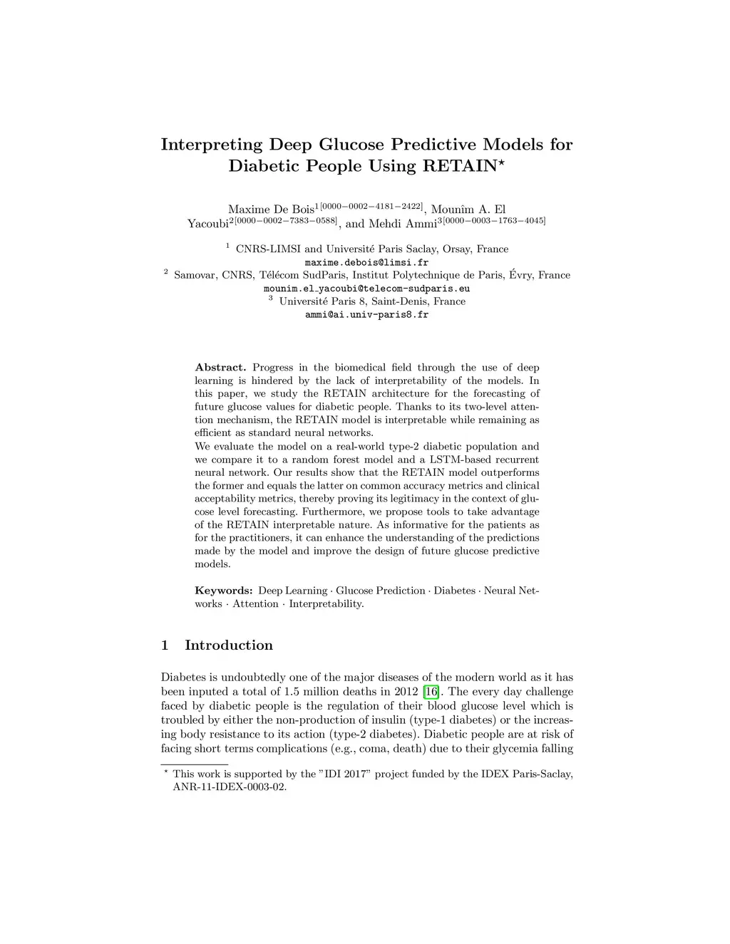 Progress in the biomedical field through the use of deep learning is hindered by the lack of interpretability of the models. In this paper, we study the RETAIN architecture for the forecasting of future glucose values for diabetic people. Thanks to its two-level attention mechanism, the RETAIN model is interpretable while remaining as efficient as standard neural networks. We evaluate the model on a real-world type-2 diabetic population and we compare it to a random forest model and a LSTM-based recurrent neural network. Our results show that the RETAIN model outperforms the former and equals the latter on common accuracy metrics and clinical acceptability metrics, thereby proving its legitimacy in the context of glucose level forecasting. Furthermore, we propose tools to take advantage of the RETAIN interpretable nature. As informative for the patients as for the practitioners, it can enhance the understanding of the predictions made by the model and improve the design of future glucose predictive models.