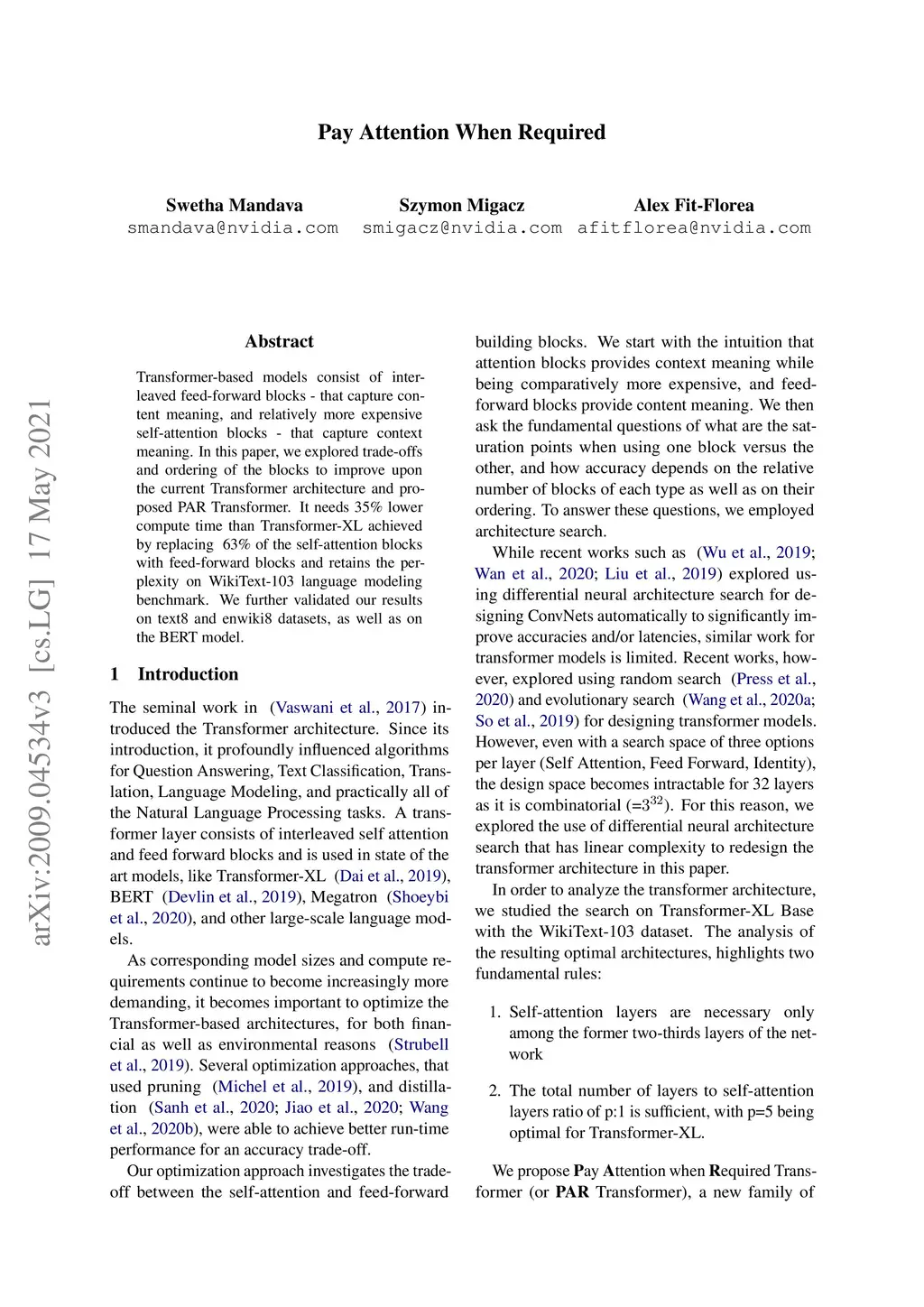 Transformer-based models consist of interleaved feed-forward blocks - that capture content meaning, and relatively more expensive self-attention blocks - that capture context meaning. In this paper, we explored trade-offs and ordering of the blocks to improve upon the current Transformer architecture and proposed PAR Transformer. It needs 35% lower compute time than Transformer-XL achieved by replacing ~63% of the self-attention blocks with feed-forward blocks, and retains the perplexity on WikiText-103 language modelling benchmark. We further validated our results on text8 and enwiki8 datasets, as well as on the BERT model.