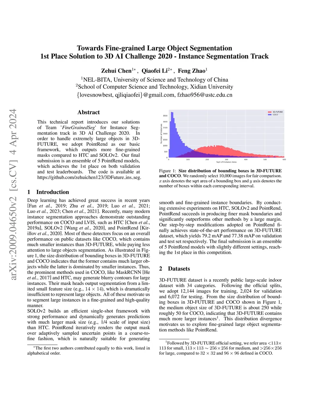 This technical report introduces our solutions of Team 'FineGrainedSeg' for Instance Segmentation track in 3D AI Challenge 2020. In order to handle extremely large objects in 3D-FUTURE, we adopt PointRend as our basic framework, which outputs more fine-grained masks compared to HTC and SOLOv2. Our final submission is an ensemble of 5 PointRend models, which achieves the 1st place on both validation and test leaderboards. The code is available at https://github.com/zehuichen123/3DFuture_ins_seg.