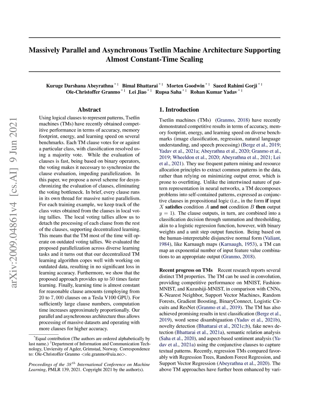 Using logical clauses to represent patterns, Tsetlin Machines (TMs) have recently obtained competitive performance in terms of accuracy, memory footprint, energy, and learning speed on several benchmarks. Each TM clause votes for or against a particular class, with classification resolved using a majority vote. While the evaluation of clauses is fast, being based on binary operators, the voting makes it necessary to synchronize the clause evaluation, impeding parallelization. In this paper, we propose a novel scheme for desynchronizing the evaluation of clauses, eliminating the voting bottleneck. In brief, every clause runs in its own thread for massive native parallelism. For each training example, we keep track of the class votes obtained from the clauses in local voting tallies. The local voting tallies allow us to detach the processing of each clause from the rest of the clauses, supporting decentralized learning. This means that the TM most of the time will operate on outdated voting tallies. We evaluated the proposed parallelization across diverse learning tasks and it turns out that our decentralized TM learning algorithm copes well with working on outdated data, resulting in no significant loss in learning accuracy. Furthermore, we show that the proposed approach provides up to 50 times faster learning. Finally, learning time is almost constant for reasonable clause amounts (employing from 20 to 7,000 clauses on a Tesla V100 GPU). For sufficiently large clause numbers, computation time increases approximately proportionally. Our parallel and asynchronous architecture thus allows processing of massive datasets and operating with more clauses for higher accuracy.