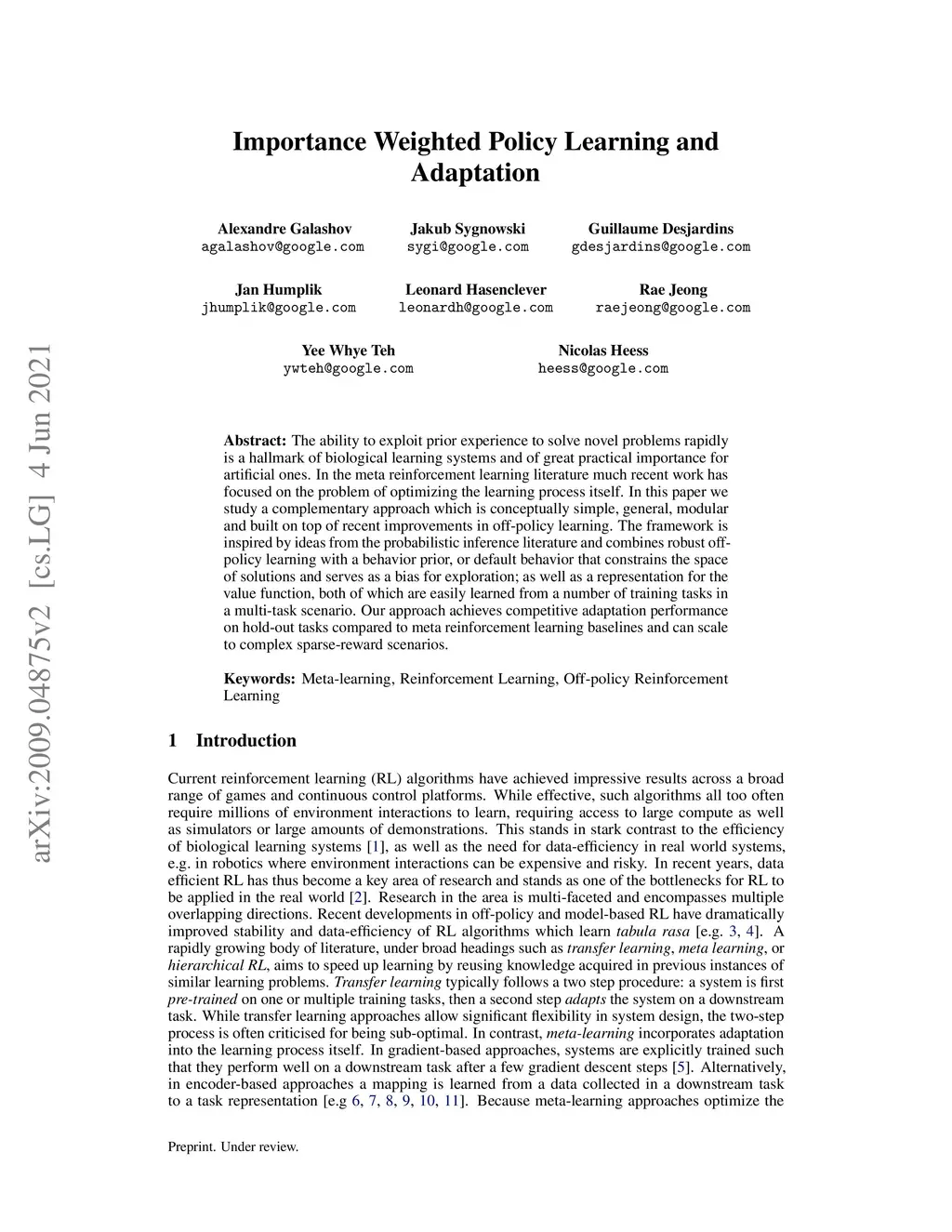 The ability to exploit prior experience to solve novel problems rapidly is a hallmark of biological learning systems and of great practical importance for artificial ones. In the meta reinforcement learning literature much recent work has focused on the problem of optimizing the learning process itself. In this paper we study a complementary approach which is conceptually simple, general, modular and built on top of recent improvements in off-policy learning. The framework is inspired by ideas from the probabilistic inference literature and combines robust off-policy learning with a behavior prior, or default behavior that constrains the space of solutions and serves as a bias for exploration; as well as a representation for the value function, both of which are easily learned from a number of training tasks in a multi-task scenario. Our approach achieves competitive adaptation performance on hold-out tasks compared to meta reinforcement learning baselines and can scale to complex sparse-reward scenarios.