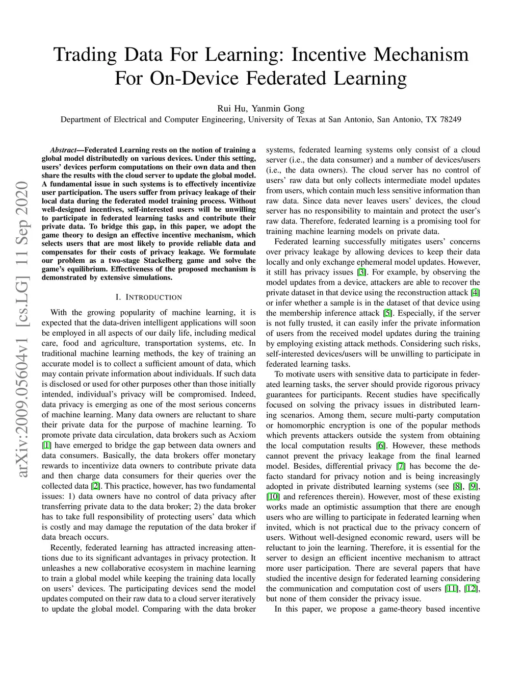 Federated Learning rests on the notion of training a global model distributedly on various devices. Under this setting, users' devices perform computations on their own data and then share the results with the cloud server to update the global model. A fundamental issue in such systems is to effectively incentivize user participation. The users suffer from privacy leakage of their local data during the federated model training process. Without well-designed incentives, self-interested users will be unwilling to participate in federated learning tasks and contribute their private data. To bridge this gap, in this paper, we adopt the game theory to design an effective incentive mechanism, which selects users that are most likely to provide reliable data and compensates for their costs of privacy leakage. We formulate our problem as a two-stage Stackelberg game and solve the game's equilibrium. Effectiveness of the proposed mechanism is demonstrated by extensive simulations.