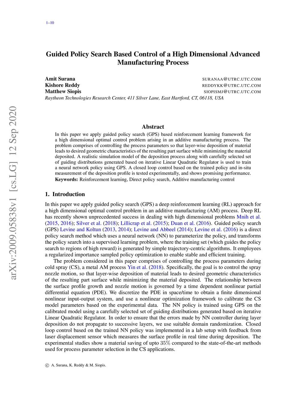 In this paper we apply guided policy search (GPS) based reinforcement learning framework for a high dimensional optimal control problem arising in an additive manufacturing process. The problem comprises of controlling the process parameters so that layer-wise deposition of material leads to desired geometric characteristics of the resulting part surface while minimizing the material deposited. A realistic simulation model of the deposition process along with carefully selected set of guiding distributions generated based on iterative Linear Quadratic Regulator is used to train a neural network policy using GPS. A closed loop control based on the trained policy and in-situ measurement of the deposition profile is tested experimentally, and shows promising performance.