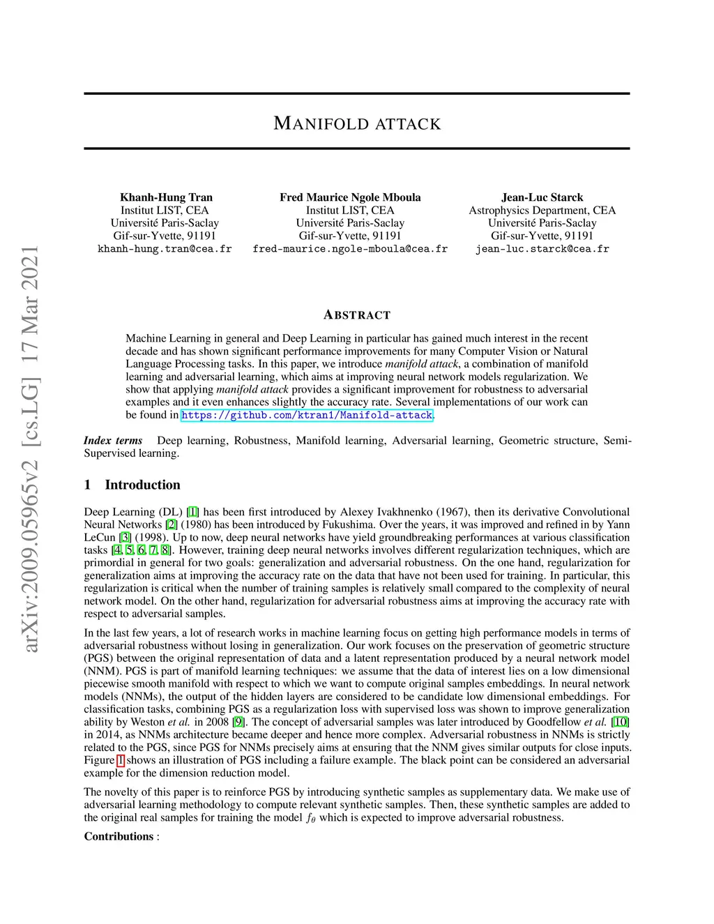 Machine Learning in general and Deep Learning in particular has gained much interest in the recent decade and has shown significant performance improvements for many Computer Vision or Natural Language Processing tasks. In order to deal with databases which have just a small amount of training samples or to deal with models which have large amount of parameters, the regularization is indispensable. In this paper, we enforce the manifold preservation (manifold learning) from the original data into latent presentation by using "manifold attack". The later is inspired in a fashion of adversarial learning : finding virtual points that distort mostly the manifold preservation then using these points as supplementary samples to train the model. We show that our approach of regularization provides improvements for the accuracy rate and for the robustness to adversarial examples.
