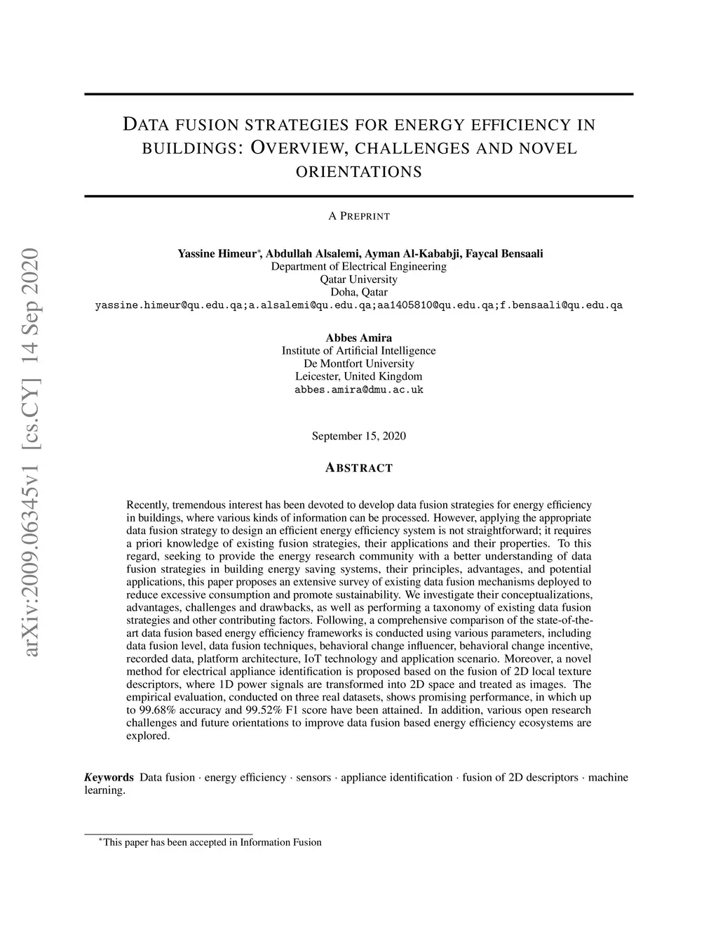Recently, tremendous interest has been devoted to develop data fusion strategies for energy efficiency in buildings, where various kinds of information can be processed. However, applying the appropriate data fusion strategy to design an efficient energy efficiency system is not straightforward; it requires a priori knowledge of existing fusion strategies, their applications and their properties. To this regard, seeking to provide the energy research community with a better understanding of data fusion strategies in building energy saving systems, their principles, advantages, and potential applications, this paper proposes an extensive survey of existing data fusion mechanisms deployed to reduce excessive consumption and promote sustainability. We investigate their conceptualizations, advantages, challenges and drawbacks, as well as performing a taxonomy of existing data fusion strategies and other contributing factors. Following, a comprehensive comparison of the state-of-the-art data fusion based energy efficiency frameworks is conducted using various parameters, including data fusion level, data fusion techniques, behavioral change influencer, behavioral change incentive, recorded data, platform architecture, IoT technology and application scenario. Moreover, a novel method for electrical appliance identification is proposed based on the fusion of 2D local texture descriptors, where 1D power signals are transformed into 2D space and treated as images. The empirical evaluation, conducted on three real datasets, shows promising performance, in which up to 99.68% accuracy and 99.52% F1 score have been attained. In addition, various open research challenges and future orientations to improve data fusion based energy efficiency ecosystems are explored.
