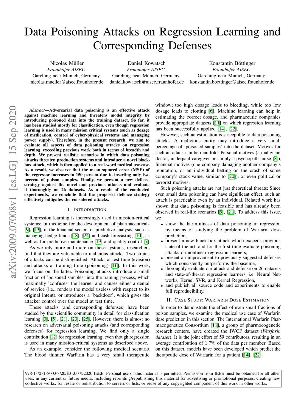 Data Poisoning Attacks on Regression Learning and Corresponding Defenses