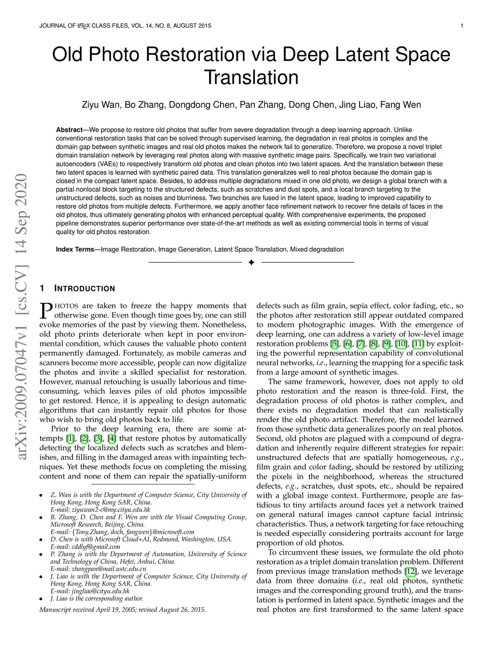 We propose to restore old photos that suffer from severe degradation through a deep learning approach. Unlike conventional restoration tasks that can be solved through supervised learning, the degradation in real photos is complex and the domain gap between synthetic images and real old photos makes the network fail to generalize. Therefore, we propose a novel triplet domain translation network by leveraging real photos along with massive synthetic image pairs. Specifically, we train two variational autoencoders (VAEs) to respectively transform old photos and clean photos into two latent spaces. And the translation between these two latent spaces is learned with synthetic paired data. This translation generalizes well to real photos because the domain gap is closed in the compact latent space. Besides, to address multiple degradations mixed in one old photo, we design a global branch with apartial nonlocal block targeting to the structured defects, such as scratches and dust spots, and a local branch targeting to the unstructured defects, such as noises and blurriness. Two branches are fused in the latent space, leading to improved capability to restore old photos from multiple defects. Furthermore, we apply another face refinement network to recover fine details of faces in the old photos, thus ultimately generating photos with enhanced perceptual quality. With comprehensive experiments, the proposed pipeline demonstrates superior performance over state-of-the-art methods as well as existing commercial tools in terms of visual quality for old photos restoration.