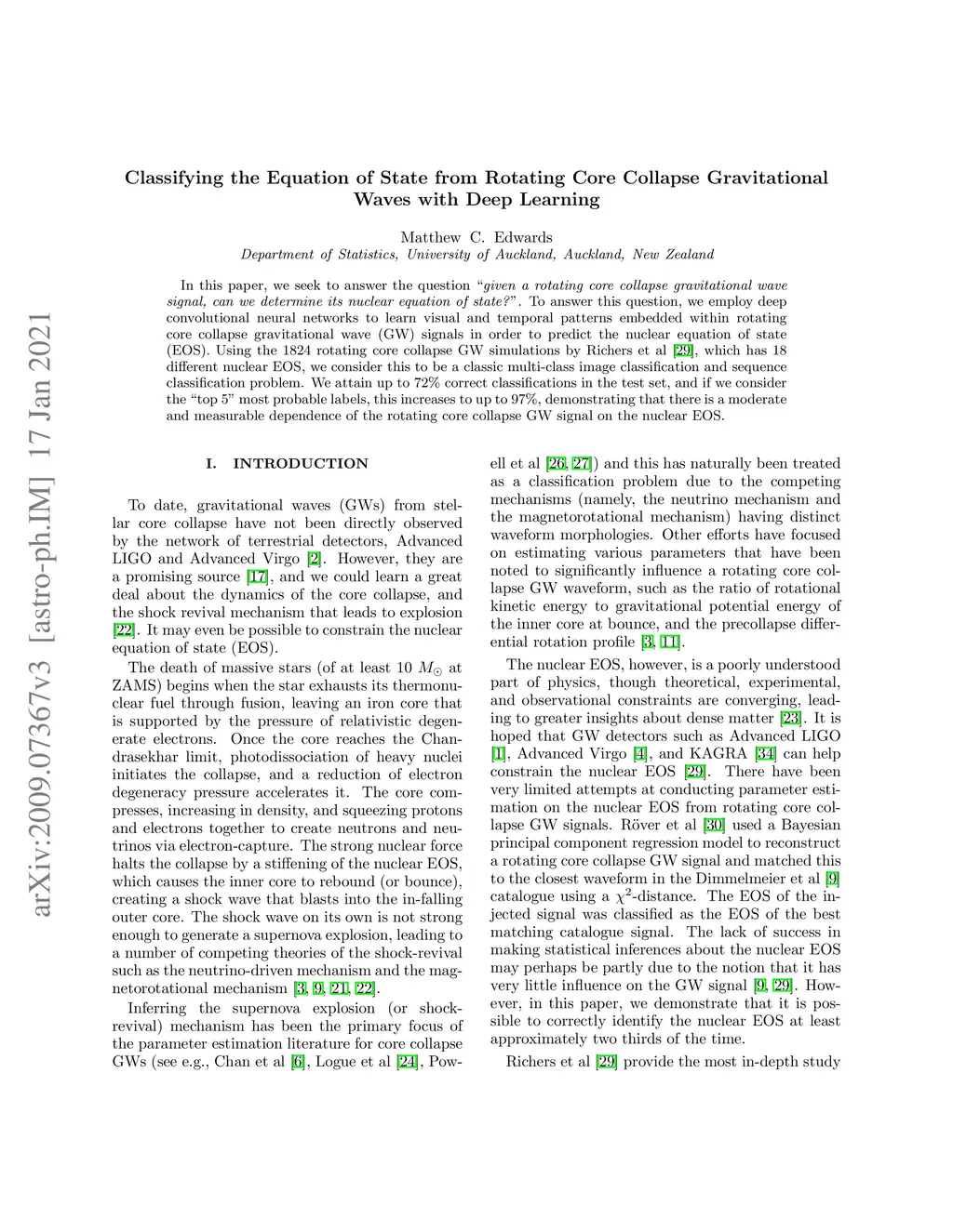 In this paper, we seek to answer the question "given a rotating core collapse gravitational wave signal, can we determine its nuclear equation of state?". To answer this question, we employ deep convolutional neural networks to learn visual and temporal patterns embedded within rotating core collapse gravitational wave (GW) signals in order to predict the nuclear equation of state (EOS). Using the 1824 rotating core collapse GW simulations by Richers et al. (2017), which has 18 different nuclear EOS, we consider this to be a classic multi-class image classification and sequence classification problem. We attain up to 72\% correct classifications in the test set, and if we consider the "top 5" most probable labels, this increases to up to 97\%, demonstrating that there is a moderate and measurable dependence of the rotating core collapse GW signal on the nuclear EOS.