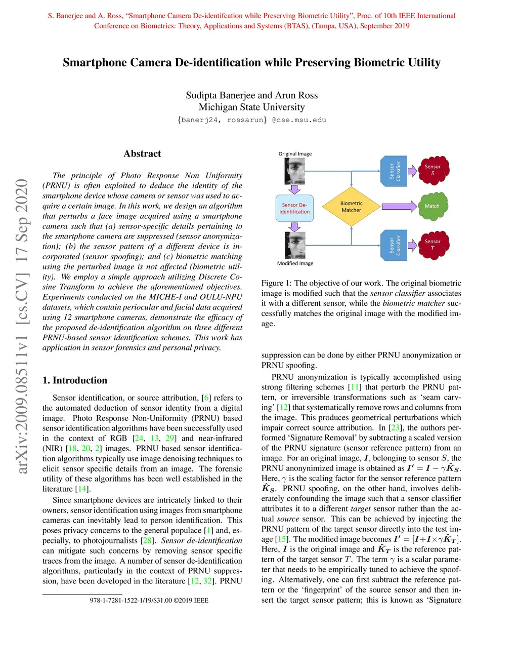 The principle of Photo Response Non Uniformity (PRNU) is often exploited to deduce the identity of the smartphone device whose camera or sensor was used to acquire a certain image. In this work, we design an algorithm that perturbs a face image acquired using a smartphone camera such that (a) sensor-specific details pertaining to the smartphone camera are suppressed (sensor anonymization); (b) the sensor pattern of a different device is incorporated (sensor spoofing); and (c) biometric matching using the perturbed image is not affected (biometric utility). We employ a simple approach utilizing Discrete Cosine Transform to achieve the aforementioned objectives. Experiments conducted on the MICHE-I and OULU-NPU datasets, which contain periocular and facial data acquired using 12 smartphone cameras, demonstrate the efficacy of the proposed de-identification algorithm on three different PRNU-based sensor identification schemes. This work has application in sensor forensics and personal privacy.