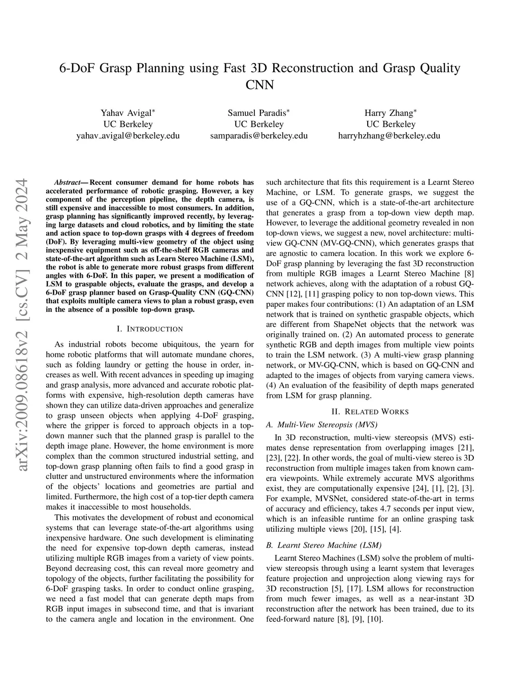 Recent consumer demand for home robots has accelerated performance of robotic grasping. However, a key component of the perception pipeline, the depth camera, is still expensive and inaccessible to most consumers. In addition, grasp planning has significantly improved recently, by leveraging large datasets and cloud robotics, and by limiting the state and action space to top-down grasps with 4 degrees of freedom (DoF). By leveraging multi-view geometry of the object using inexpensive equipment such as off-the-shelf RGB cameras and state-of-the-art algorithms such as Learn Stereo Machine (LSM\cite{kar2017learning}), the robot is able to generate more robust grasps from different angles with 6-DoF. In this paper, we present a modification of LSM to graspable objects, evaluate the grasps, and develop a 6-DoF grasp planner based on Grasp-Quality CNN (GQ-CNN\cite{mahler2017dex}) that exploits multiple camera views to plan a robust grasp, even in the absence of a possible top-down grasp.