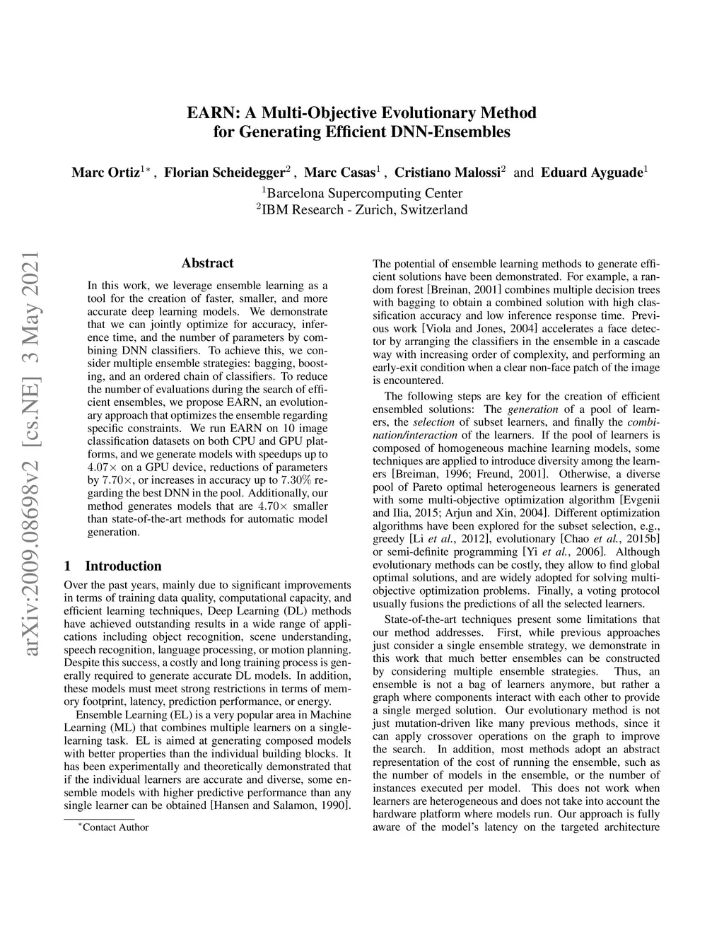 In this work, we leverage ensemble learning as a tool for the creation of faster, smaller, and more accurate deep learning models. We demonstrate that we can jointly optimize for accuracy, inference time, and the number of parameters by combining DNN classifiers. To achieve this, we combine multiple ensemble strategies: bagging, boosting, and an ordered chain of classifiers. To reduce the number of DNN ensemble evaluations during the search, we propose EARN, an evolutionary approach that optimizes the ensemble according to three objectives regarding the constraints specified by the user. We run EARN on 10 image classification datasets with an initial pool of 32 state-of-the-art DCNN on both CPU and GPU platforms, and we generate models with speedups up to , reductions of parameters by , or increases in accuracy up to regarding the best DNN in the pool. In addition, our method generates models that are faster than the state-of-the-art methods for automatic model generation.