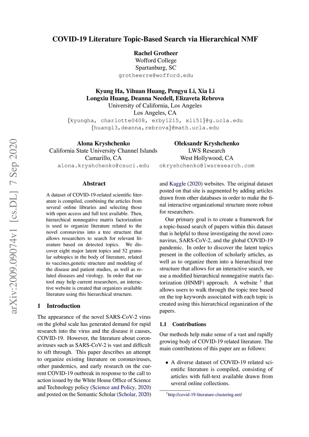 COVID-19 Literature Topic-Based Search via Hierarchical NMF