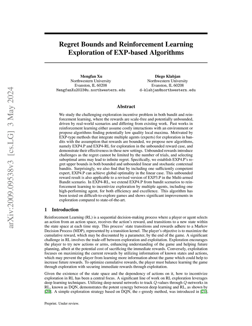 Regret Bounds and Reinforcement Learning Exploration of EXP-based