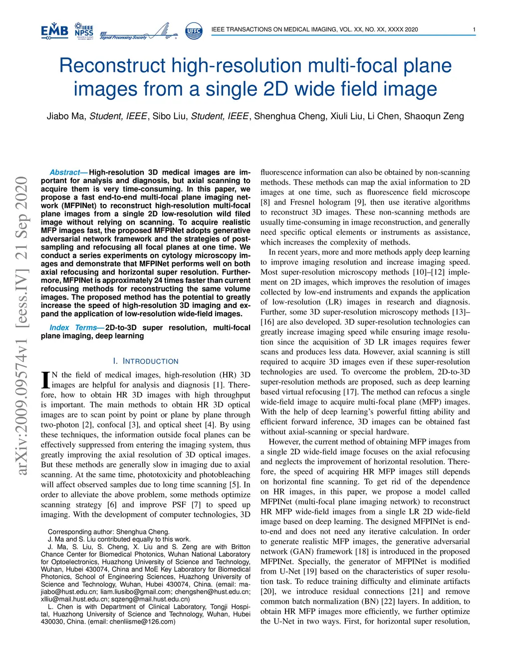 High-resolution 3D medical images are important for analysis and diagnosis, but axial scanning to acquire them is very time-consuming. In this paper, we propose a fast end-to-end multi-focal plane imaging network (MFPINet) to reconstruct high-resolution multi-focal plane images from a single 2D low-resolution wild filed image without relying on scanning. To acquire realistic MFP images fast, the proposed MFPINet adopts generative adversarial network framework and the strategies of post-sampling and refocusing all focal planes at one time. We conduct a series experiments on cytology microscopy images and demonstrate that MFPINet performs well on both axial refocusing and horizontal super resolution. Furthermore, MFPINet is approximately 24 times faster than current refocusing methods for reconstructing the same volume images. The proposed method has the potential to greatly increase the speed of high-resolution 3D imaging and expand the application of low-resolution wide-field images.